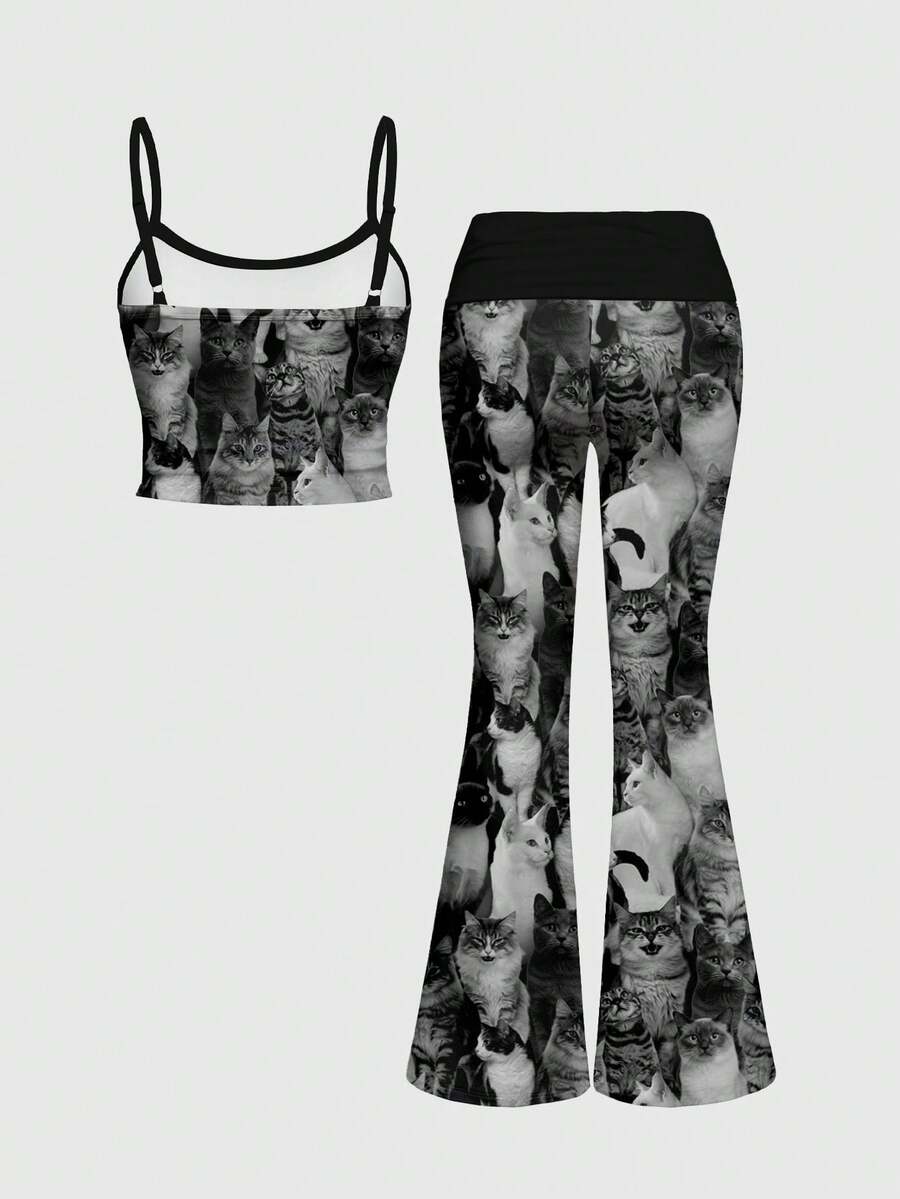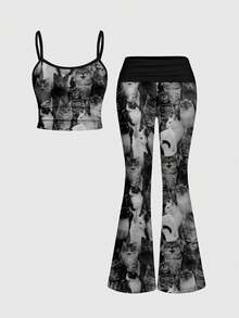 [Lingerie] Ensemble 2 pièces femme, Débardeur sexy à bretelles et pantalon évasé à taille basse froncé
