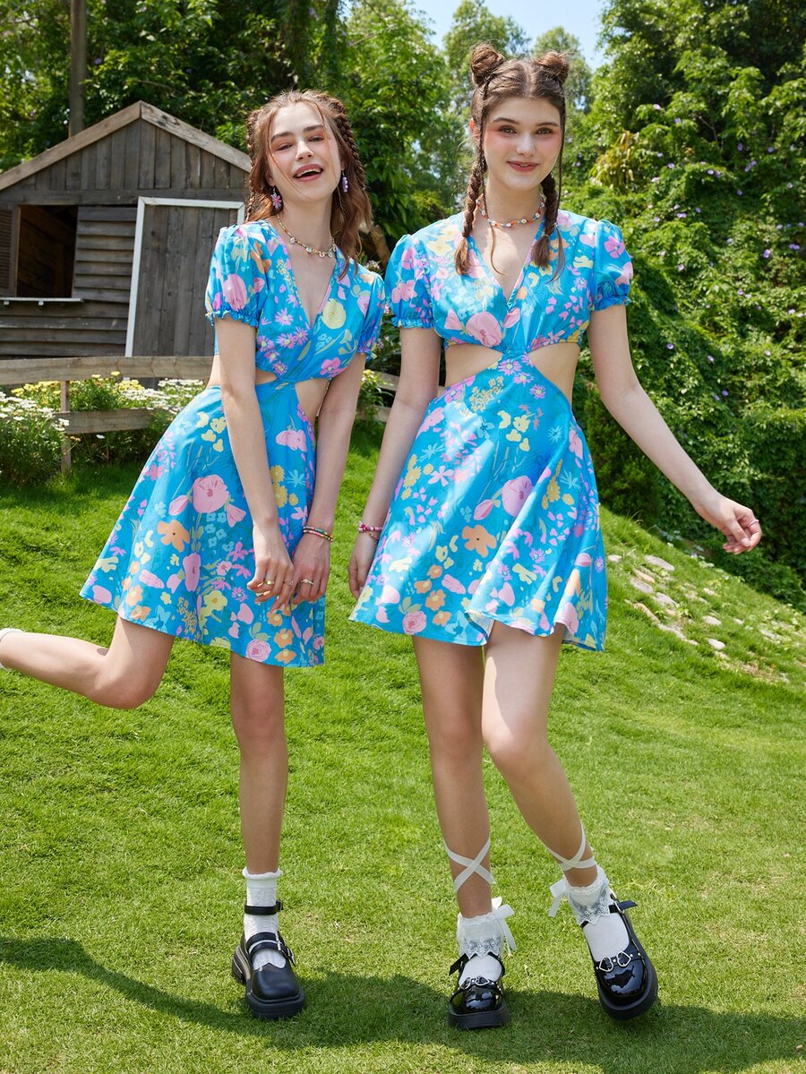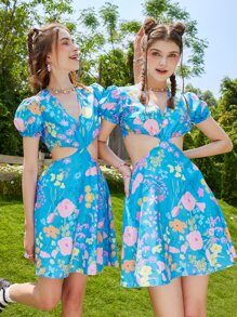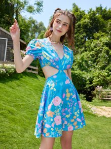 1 pièce Robe à imprimé floral découpe dos-nu à nœud