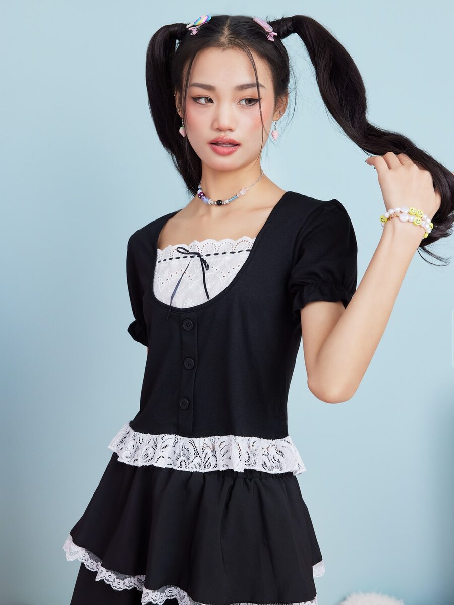 Top 2 en 1 à manches bouffantes à broderie anglaise à bouton