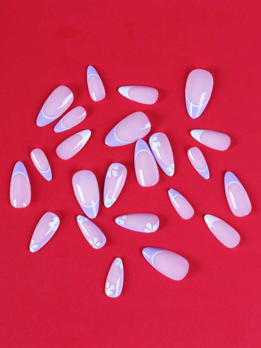 24 pièces Faux ongles long amande fleuri & 1 feuille Ruban