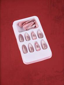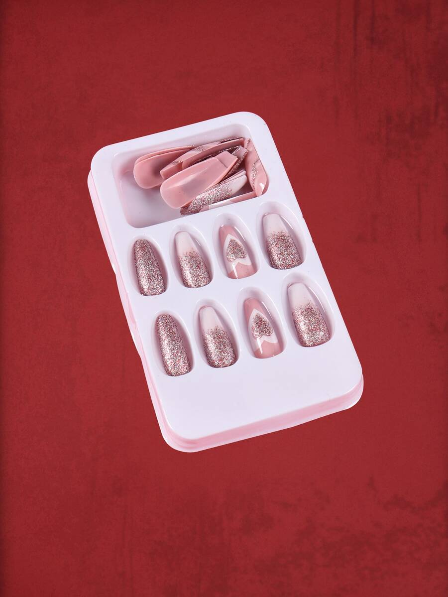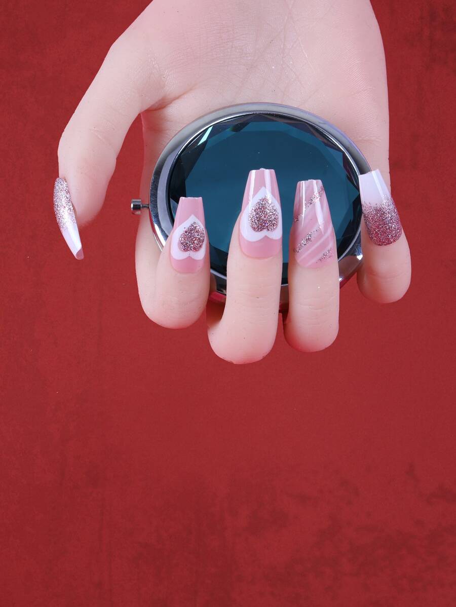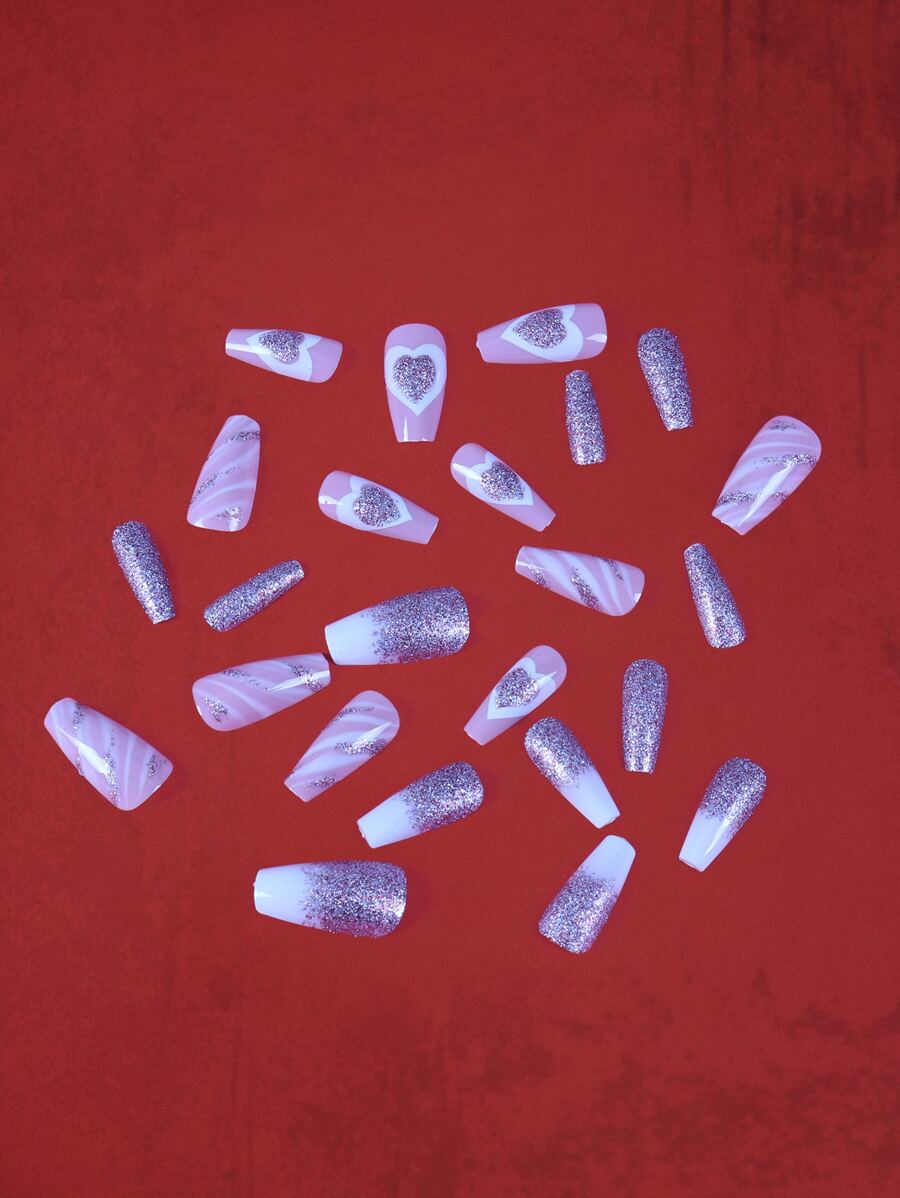 Grunge Punk 24 pièces Faux ongles long cercueil avec motif cœur scintillant & 1 feuille ruban