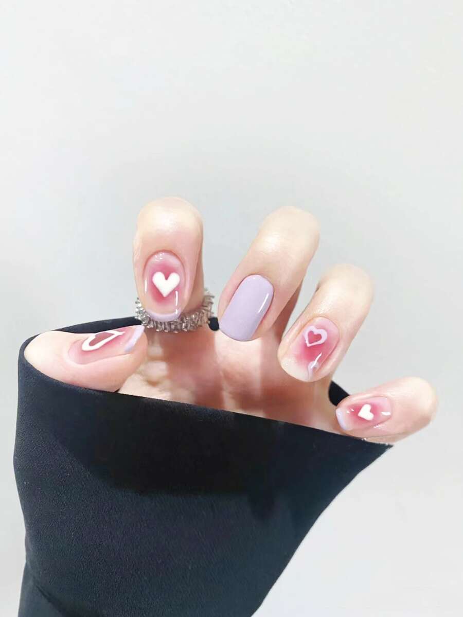 24 pièces Faux ongles long ovale avec motif cœur