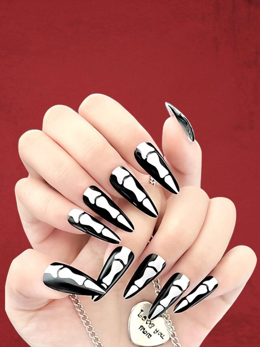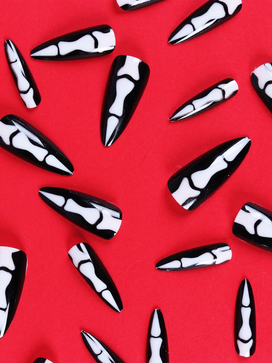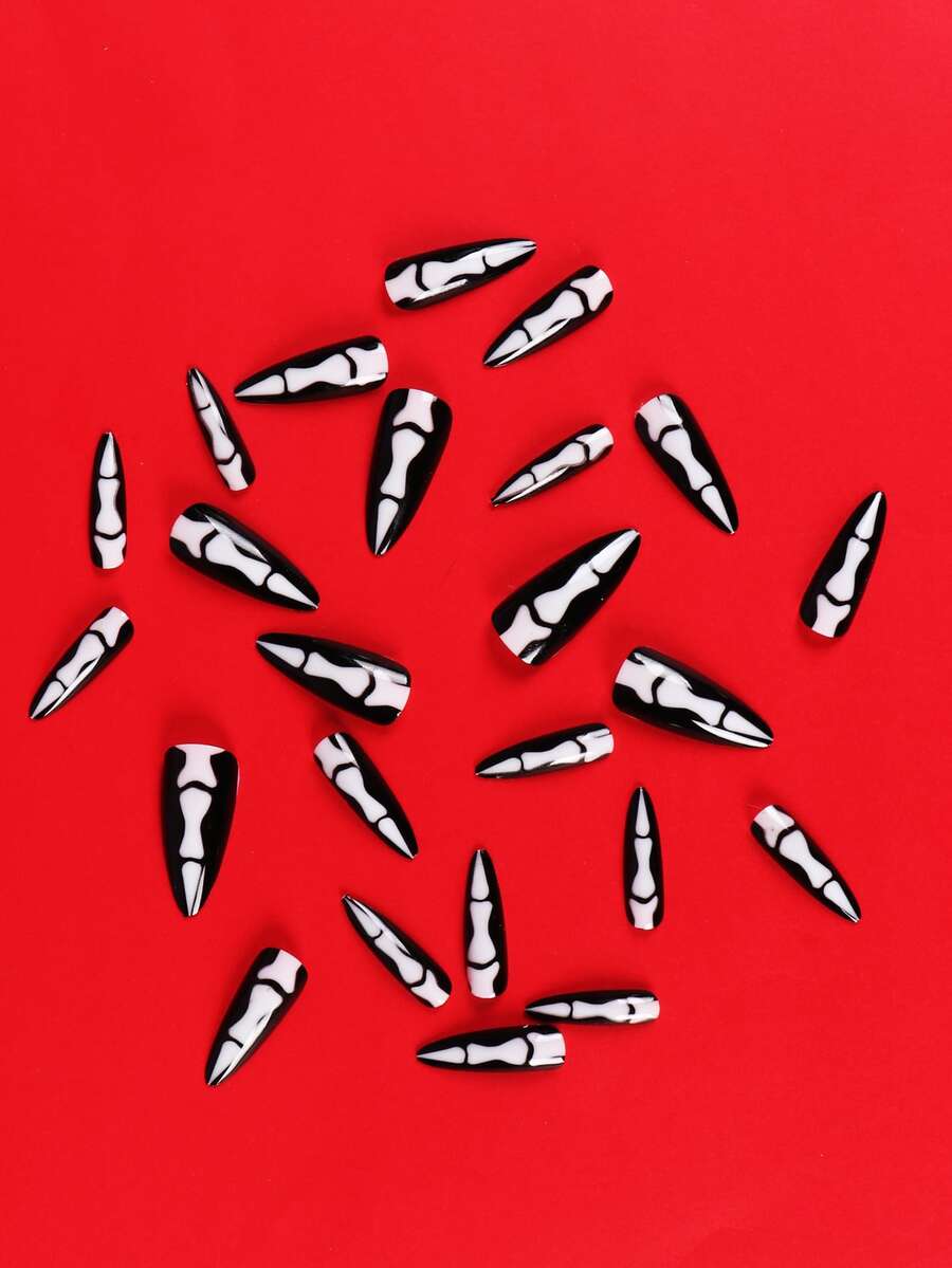 24 pièces Faux ongles long à talons aiguilles à motif d'os & 1 feuille ruban