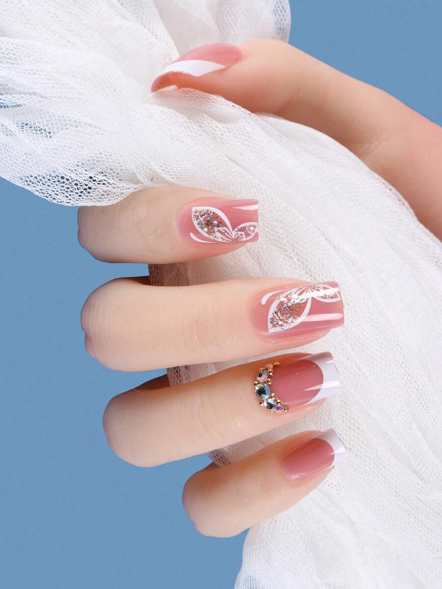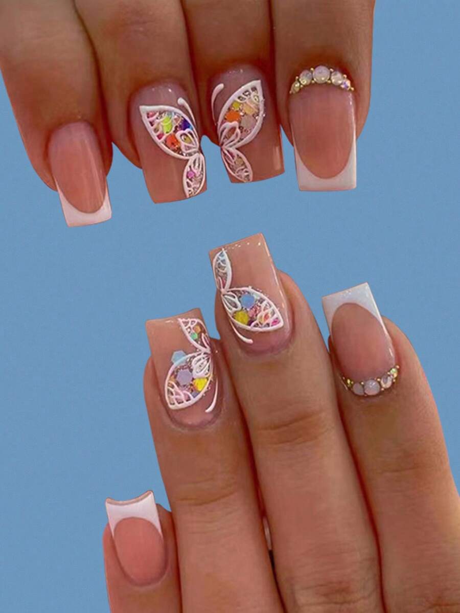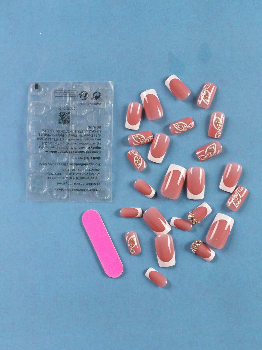 24 pièces court carré à motif papillon Faux ongles & 1 pièce lime à ongles & 1 feuille ruban