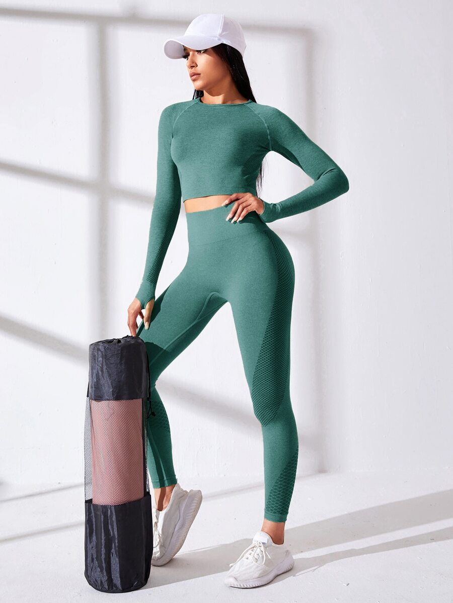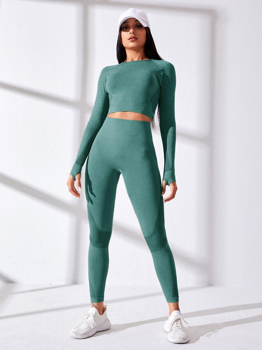 2 pièces Set de yoga sans couture Costume de sport Top avec trous pour les pouces Manches raglan Top Leggings moulants Leggings côtelés Ensemble de deux pièces vertGym Leggings SetLeggings et Top SetEnsemble sans couture