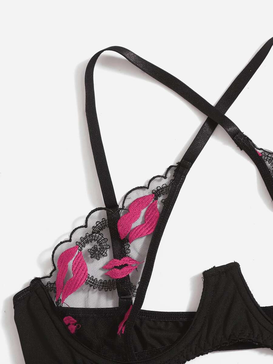 3 pièces Ensemble de lingerie bouche à broderie découpé jarretière