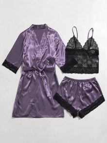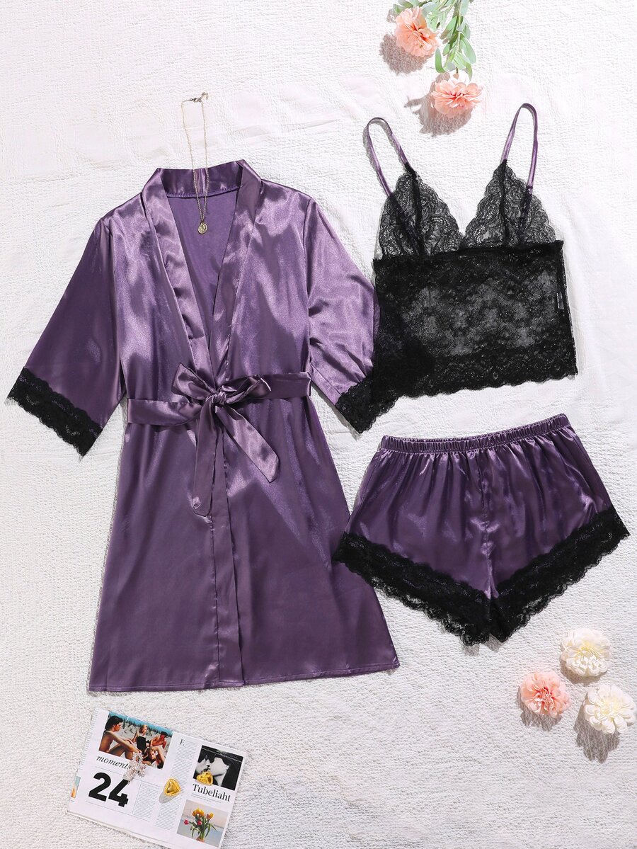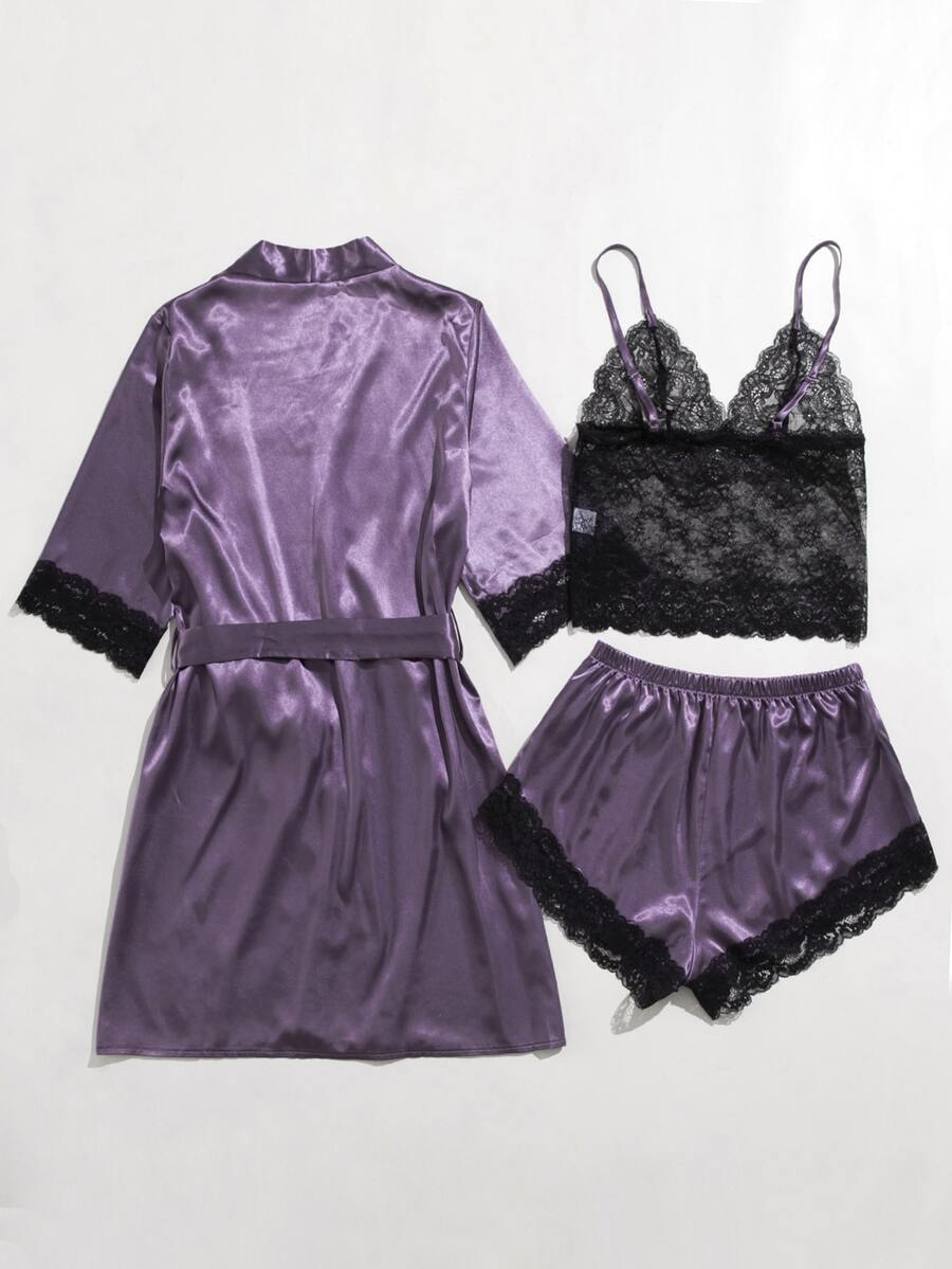 3 pièces Ensemble de peignoir ceinturé en dentelle