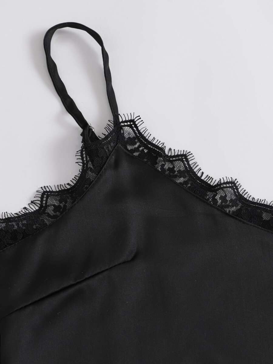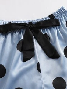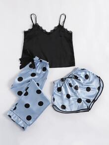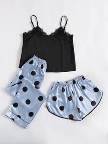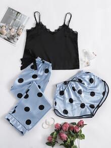 3 pièces Ensemble de pyjama en satin à pois à ourlet en dentelle