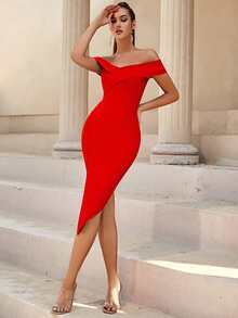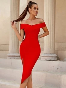 Robe bandage cocktail à col bardot fendu zippé fête moulante