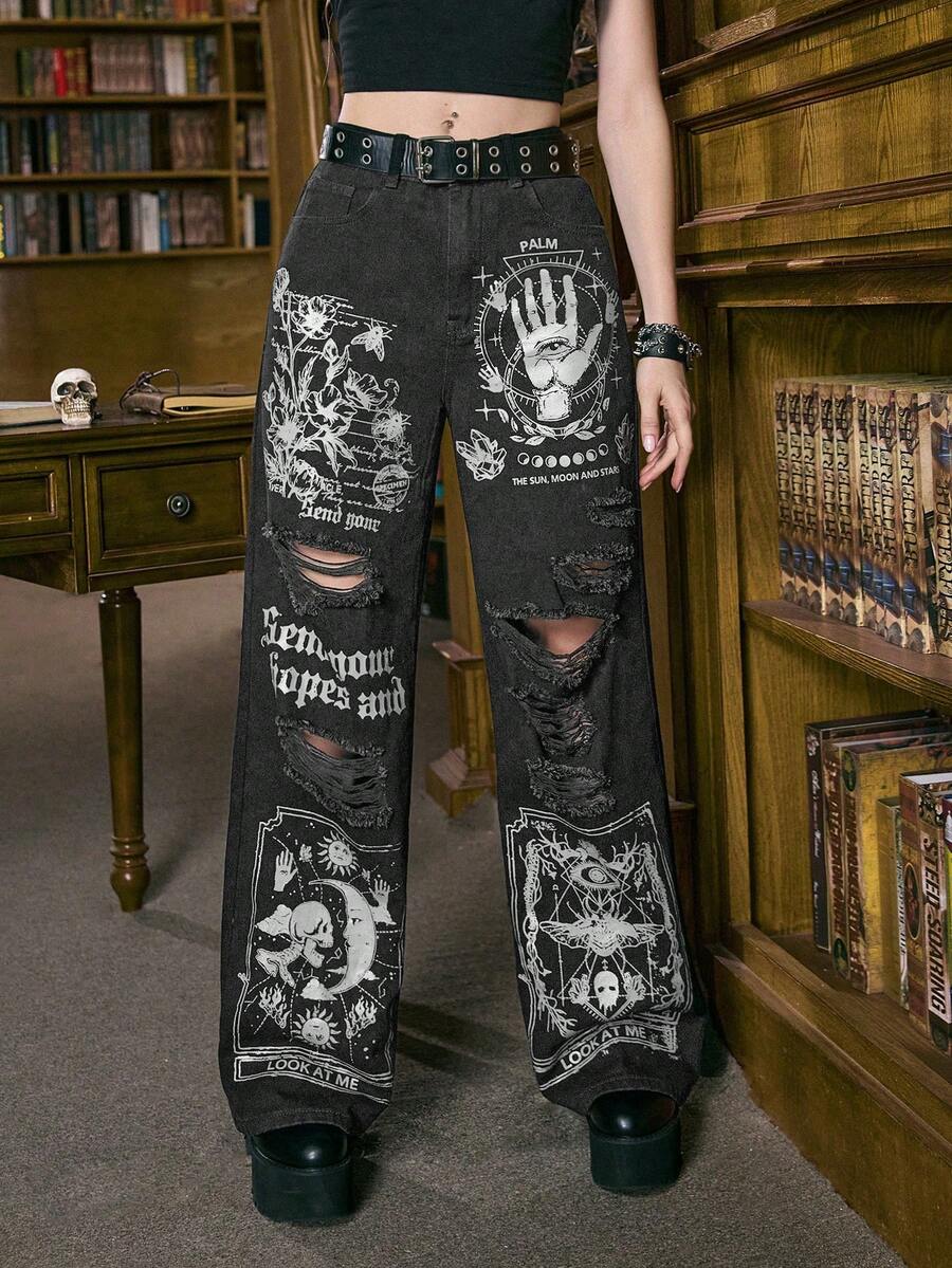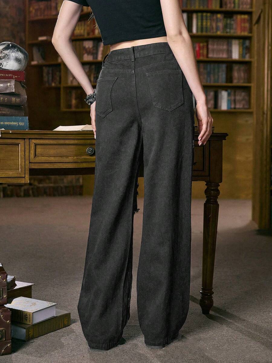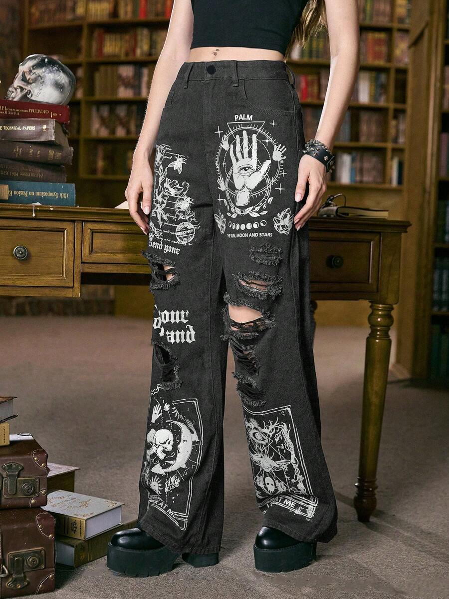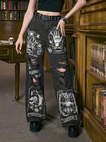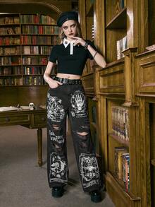 Academia Jeans en denim de mode de rue avec poches imprimées et délavées
