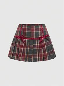 Academia Jupe À Carreaux Rouge De Style Collège Vintage Avec Décoration De Nœud Papillon Et Ourlet Plissé Et Une Paire De Leggings Pour Femmes
