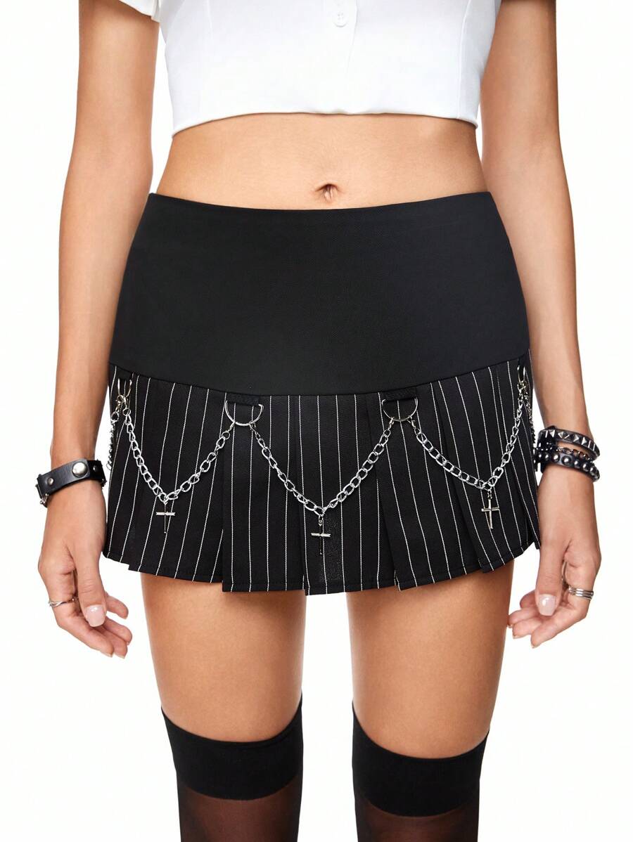 Academia Pendentif en croix pour femmes, jupe plissée rayée à la taille basse avec chaîne
