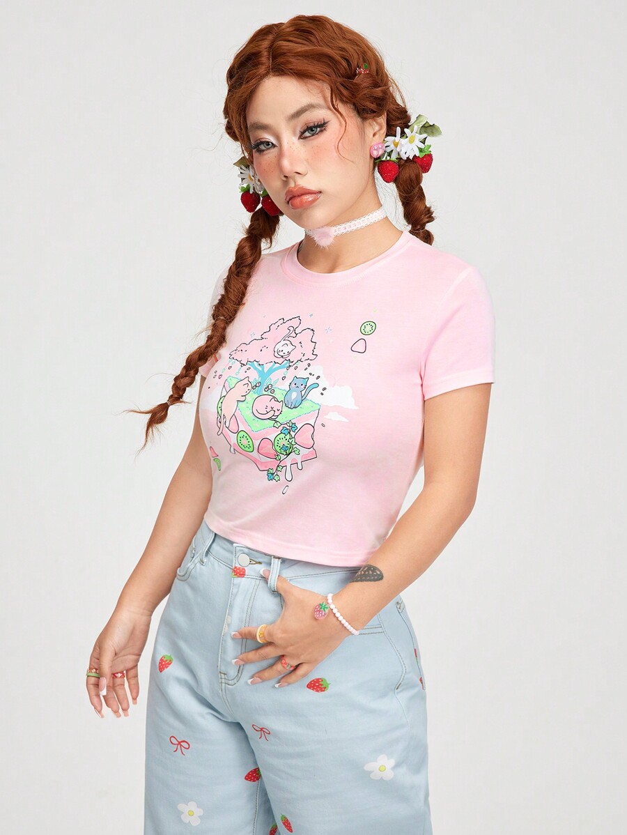 Ajtuana T-shirt À Manches Courtes Avec Imprimé De Chat Mignon