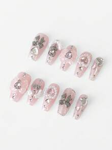 10 pièces de faux ongles peints à la main avec des éléments de style mignon comme des nœuds, des ailes et des cœurs, de haute qualité + 3 pièces de ruban adhésif double face. Manucure en forme de cercueil moyenne avec paillettes diamant style Y2K, convient pour les fêtes, les bals de promo et le port quotidien.
