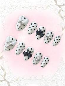 Anime 10 pièces Faux ongles de haute qualité faits main avec nœud papillon mignon, note de musique, étoile + 3 pièces adhésif double face, stickers d'art pour ongles amovibles style français Y2K avec chaîne de strass et pois, convient pour les vacances, les fêtes, la danse et le port quotidien