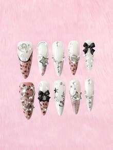 Anime 10 pièces Faux ongles de haute qualité faits main avec nœud papillon mignon, note de musique et étoile + 3 pièces adhésif double face, stickers d'art pour ongles amovibles style français Y2K avec chaîne de strass et pois, convient pour les vacances, les fêtes, la danse et le port quotidien