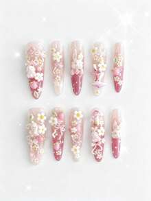 Anime 10 pièces Faux ongles de haute qualité faits main avec nœud papillon mignon, note de musique et étoile + 3 pièces adhésif double face, stickers d'art pour ongles amovibles style Y2K avec chaîne de strass et pois, convient pour les vacances, les fêtes, la danse et le port quotidien