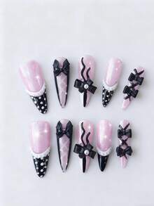 Anime 10 pièces Faux ongles de haute qualité faits main avec nœud papillon mignon, note de musique et étoile + 3 pièces adhésif double face, stickers d'art pour ongles amovibles style Y2K avec chaîne de strass et pois, convient pour les vacances, les fêtes, la danse et le port quotidien
