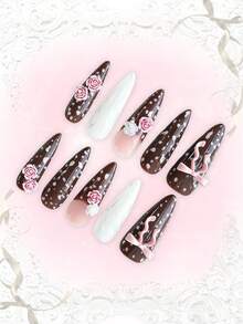 Anime 10 pièces Faux ongles de haute qualité faits main avec nœud papillon mignon, notes de musique et étoiles + 3 pièces adhésif double face, stickers d'art pour ongles amovibles style Y2K avec chaîne de strass et pois, convient pour les vacances, les fêtes, la danse et le port quotidien