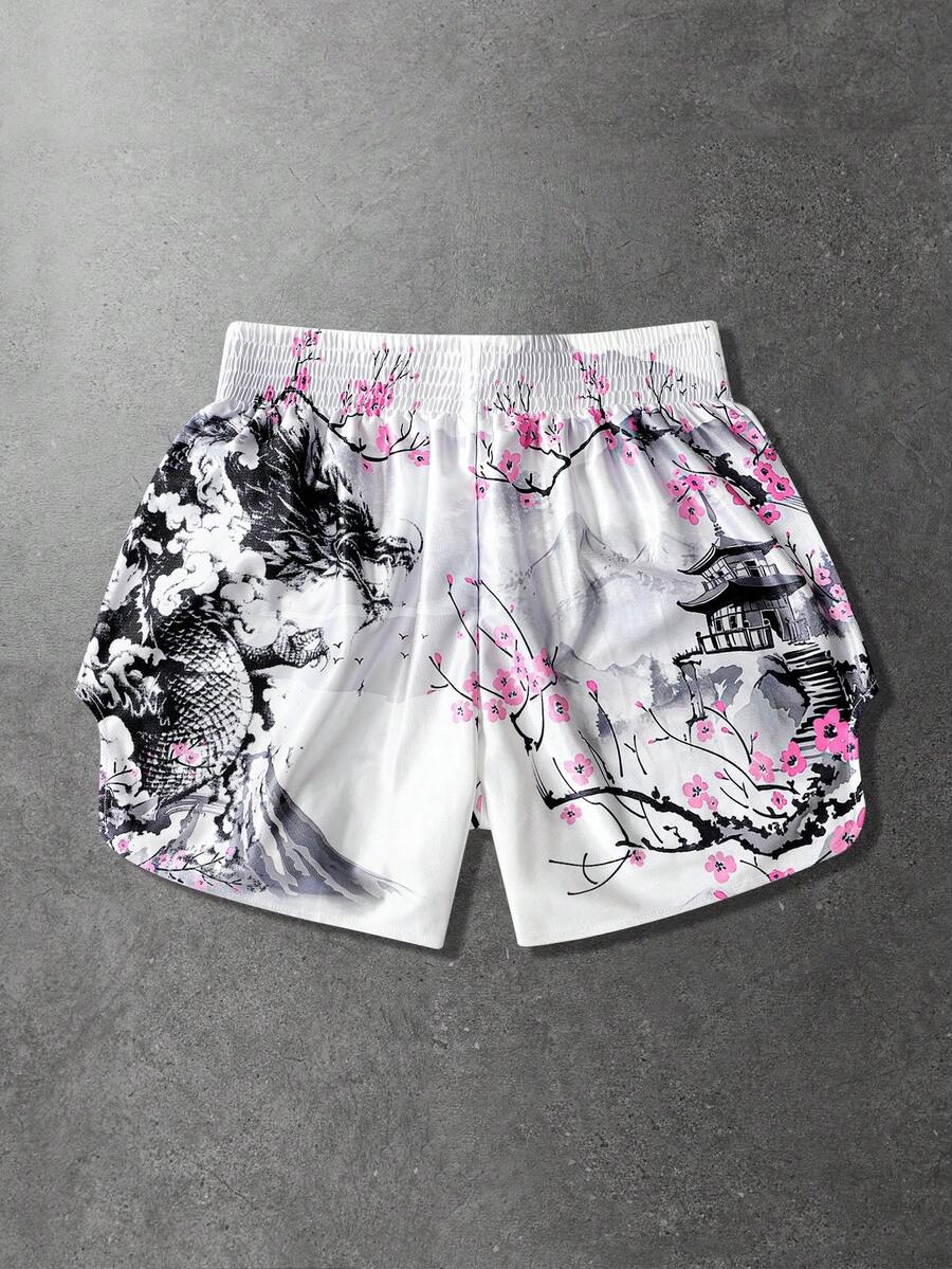 Anime Short de boxe ample à taille élastique avec imprimé de style japonais pour hommes