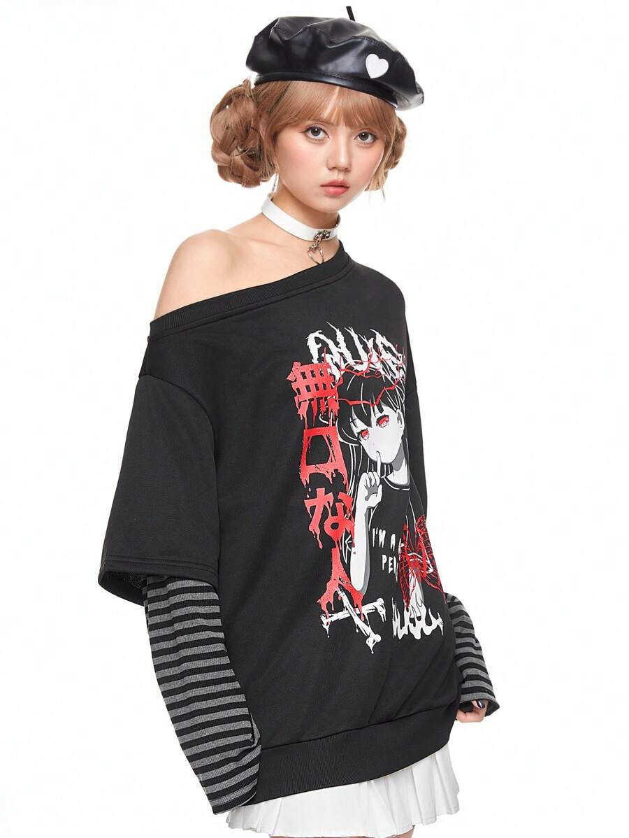 Anime Sweat-shirt à motif de dessin animé avec épaule oblique et empiècement pour femme