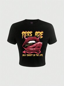 T-shirt court à manches courtes d'artiste avec impression de slogan à lèvres et ajusté, en coton