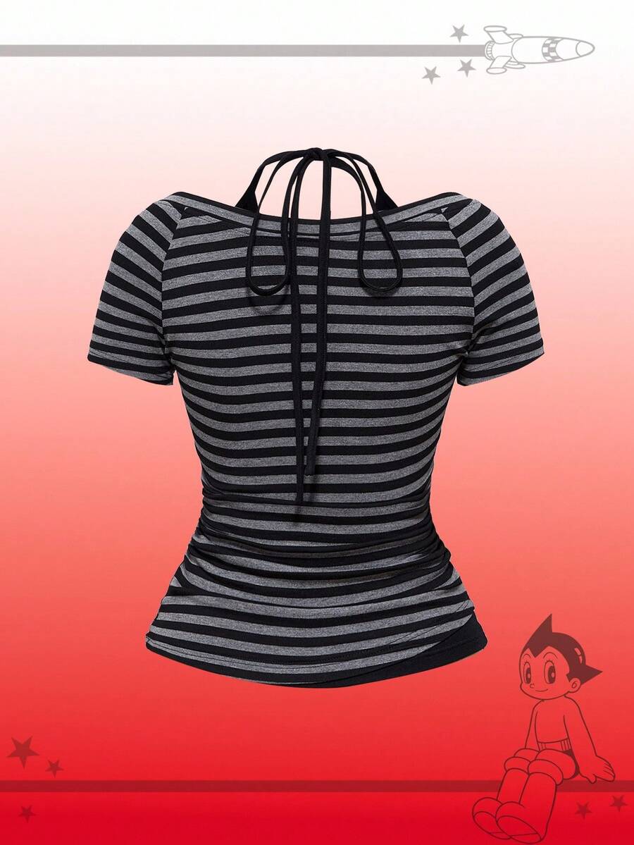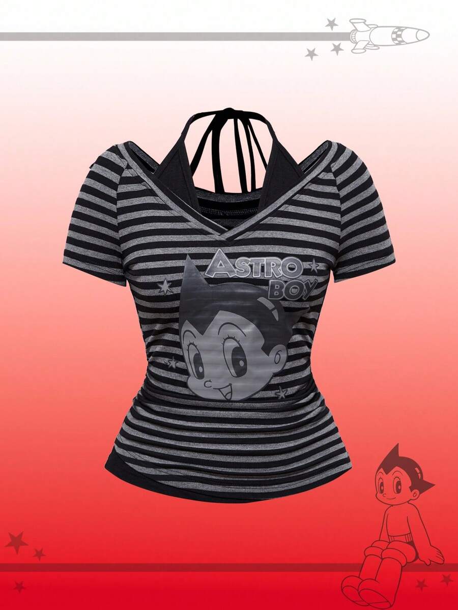 Astro Boy X ROMWE Femmes Rétro Rayé Imprimé 2 En 1 T-Shirt Moulant