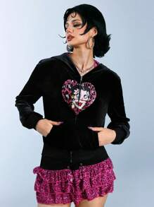 Betty Boop | ROMWE Sweatshirt rose en velours avec cœur léopard, broderie de cœur pailleté et style "Sweet & Spicy Betty" Y2K pour femmes