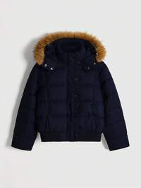 Veste courte vintage pour déplacements quotidiens pour femmes, manteau matelassé avec col épais en fourrure et capuche, bleu marine, hiver