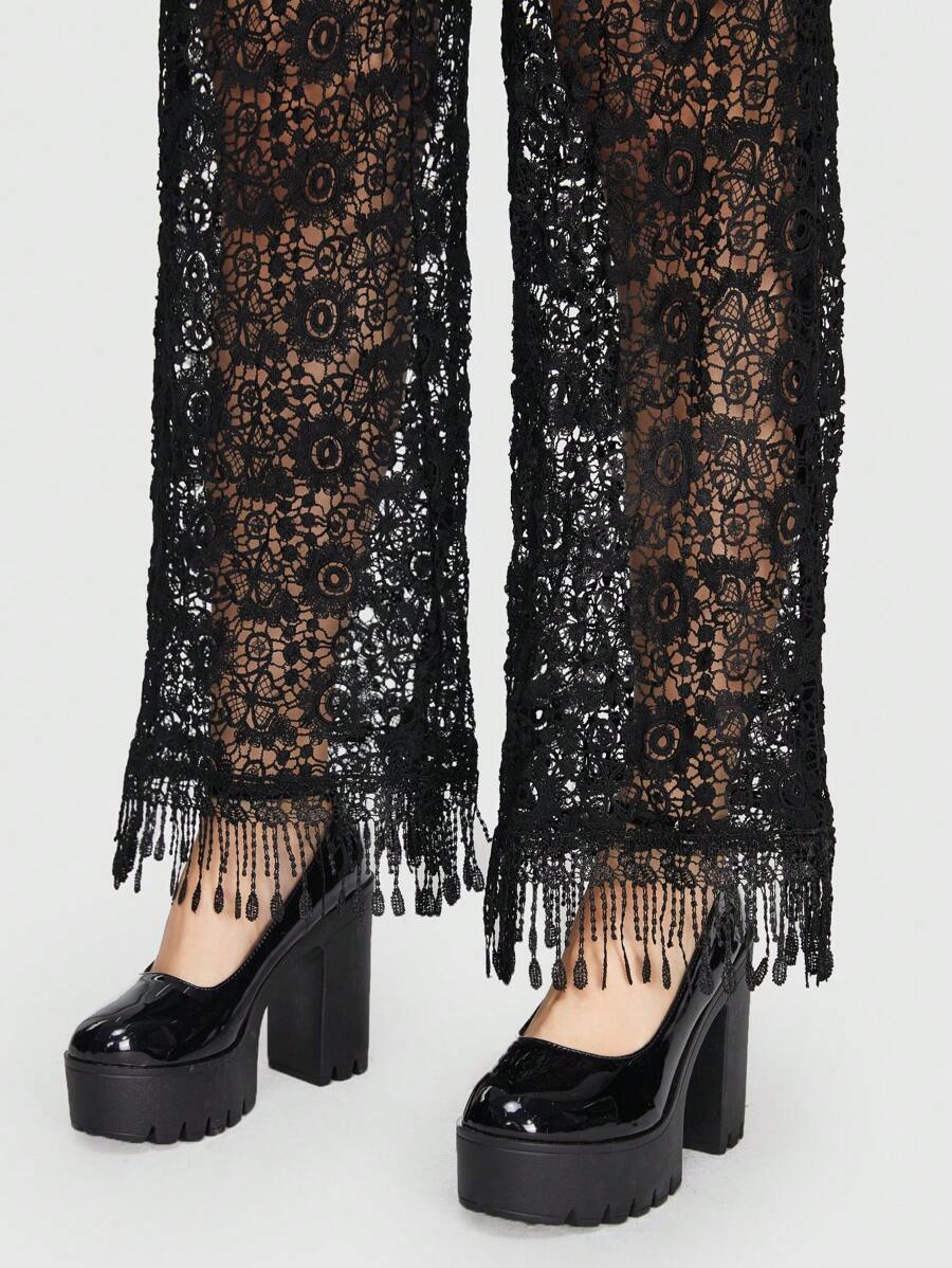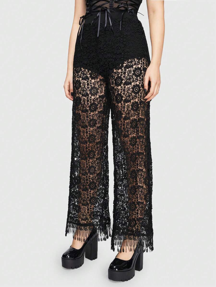 Pantalon Large Pour Femme À Style Boho Gothique, Avec Ourlet En Dentelle Soluble Dans L'eau, Panneau En Maille Et Détails De Gland