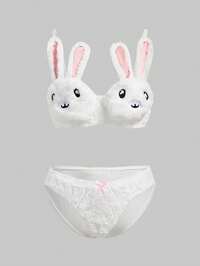 Kawaii Ensemble de soutien-gorge et culotte matelassé en peluche mignon avec broderie de lapin sans armature