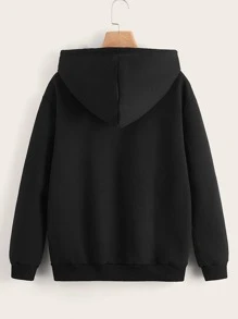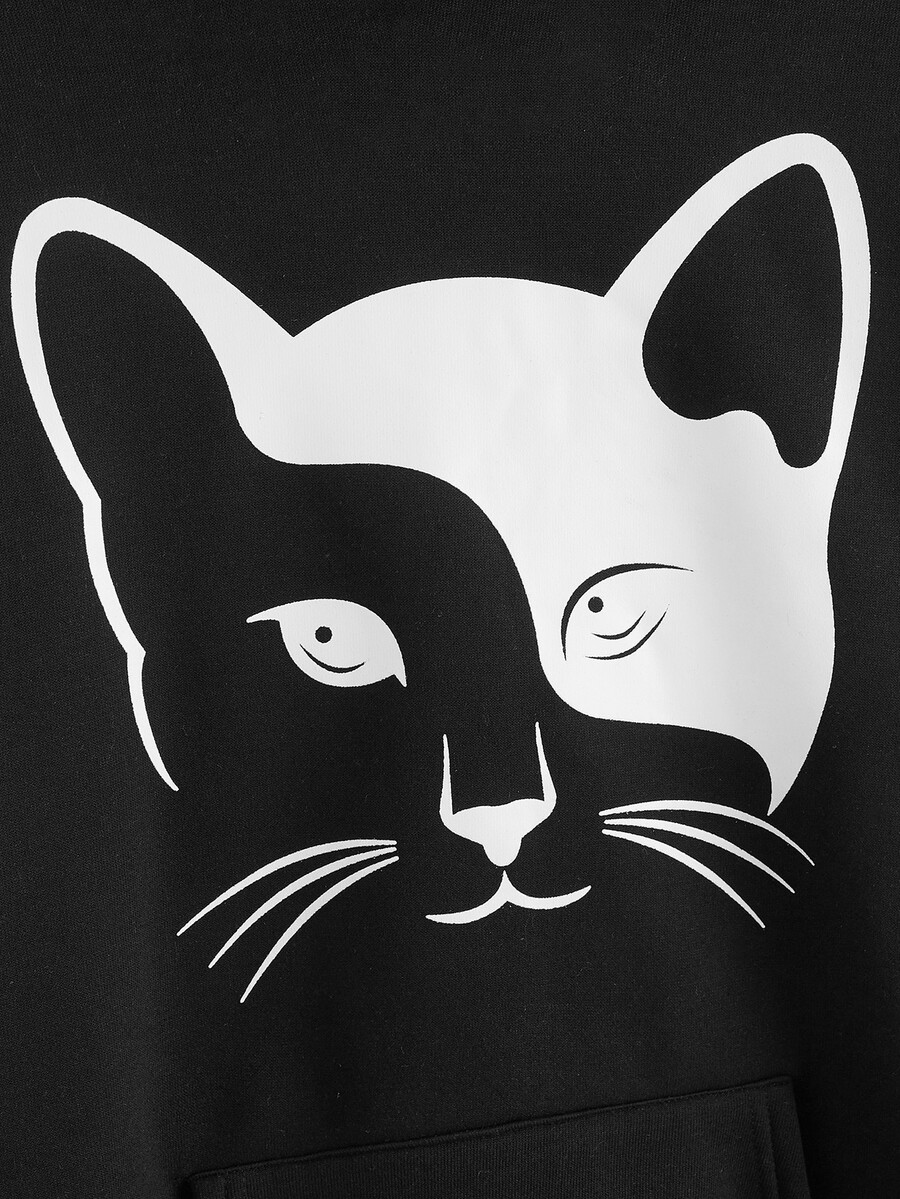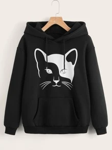 Sweat-shirt à capuche à imprimé chat à poche kangourou à cordon à doublure thermique