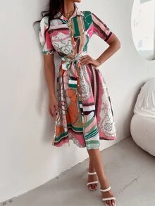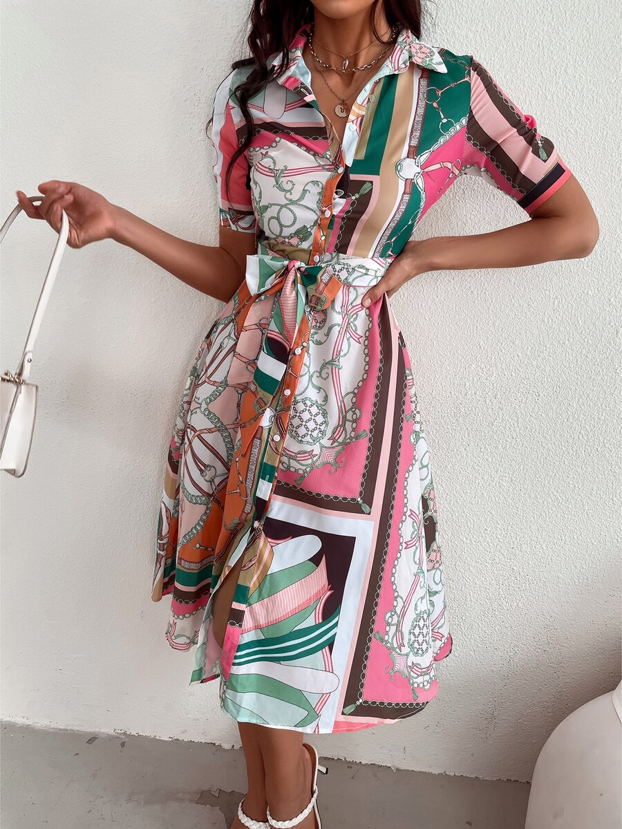 Robe chemise à imprimé chaîne ceinturée à bouton