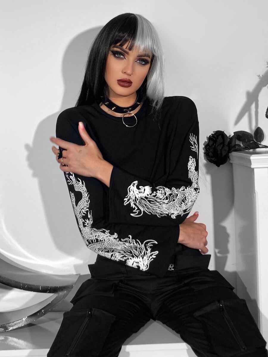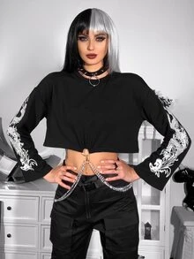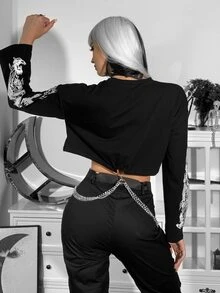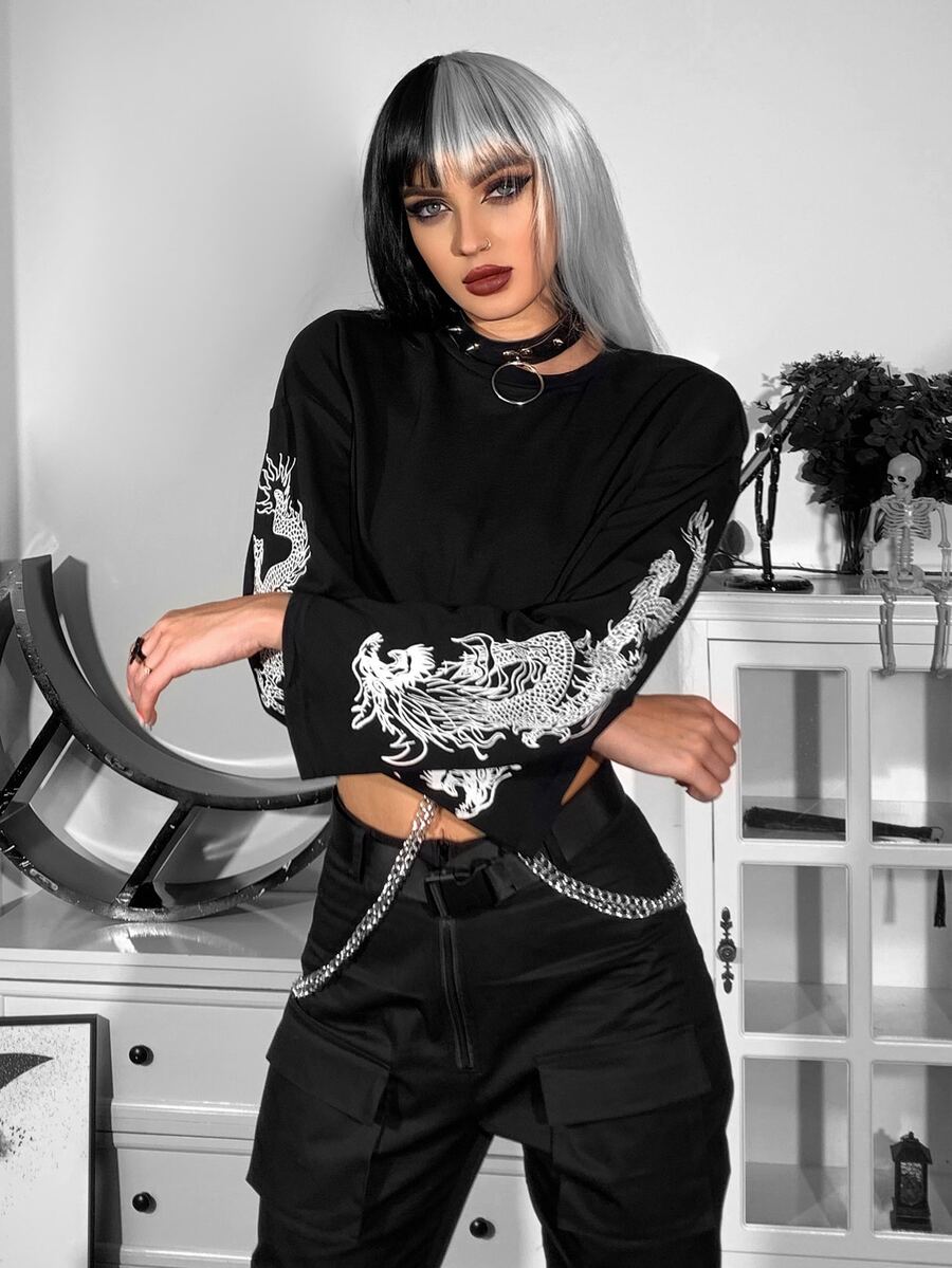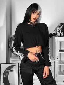 Pull court à imprimé dragon chinois avec chaîne à anneau