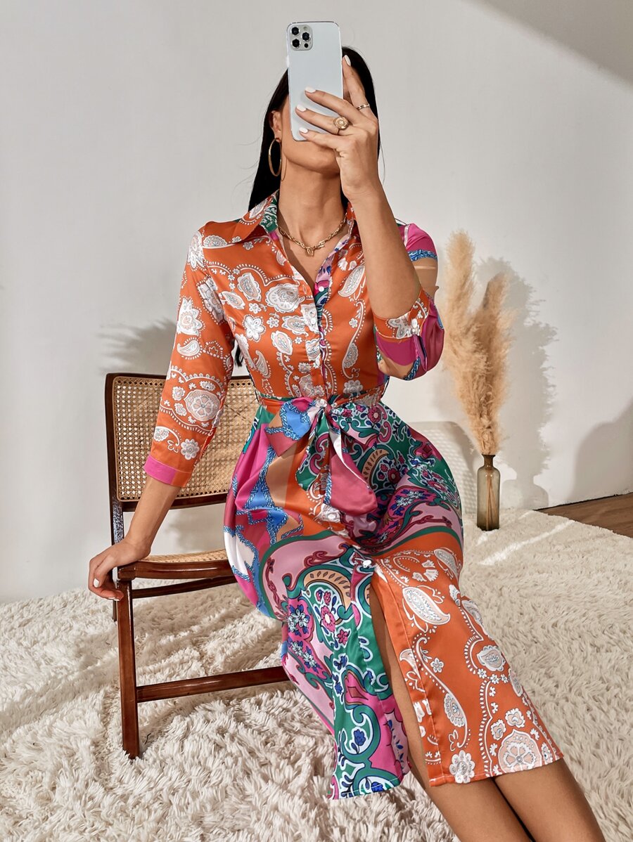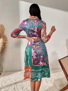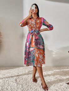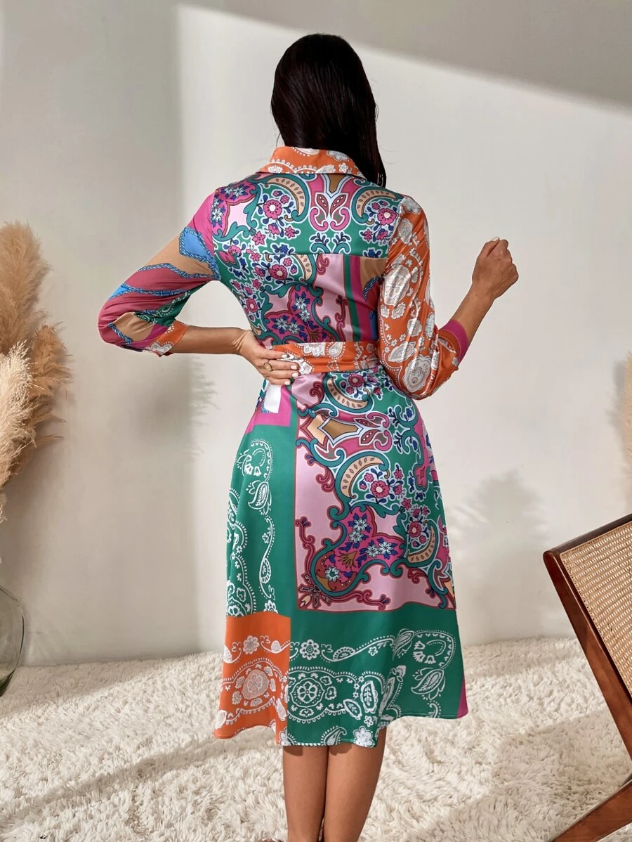 Robe chemise ceinturée à blocs de couleurs à imprimé