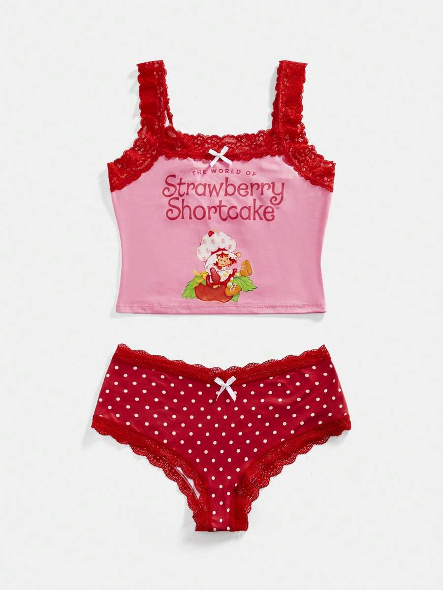 Soutien-gorge sans fil à motif de dentelle contrastée et dessin animé, et culotte assortie à pois avec nœud, pour femmes