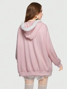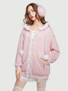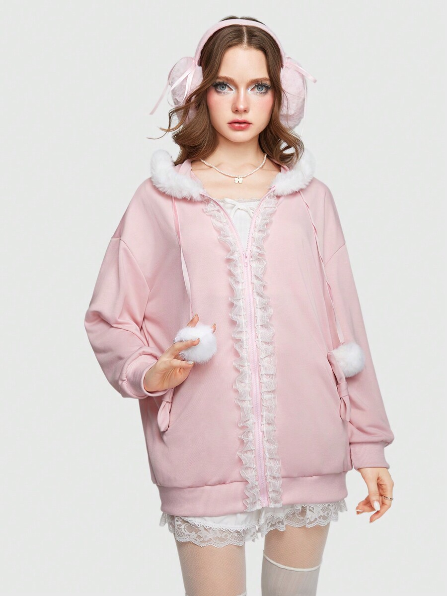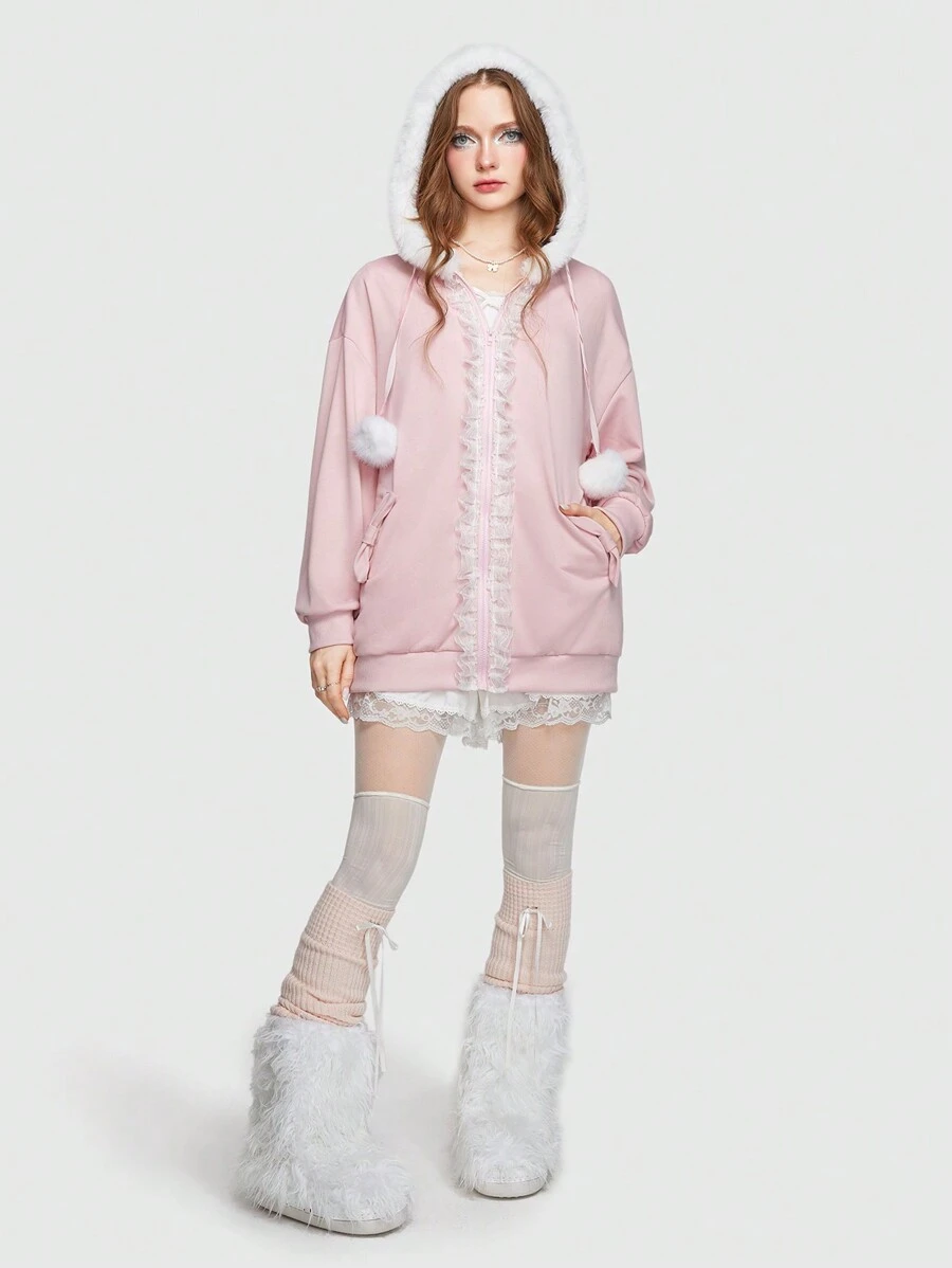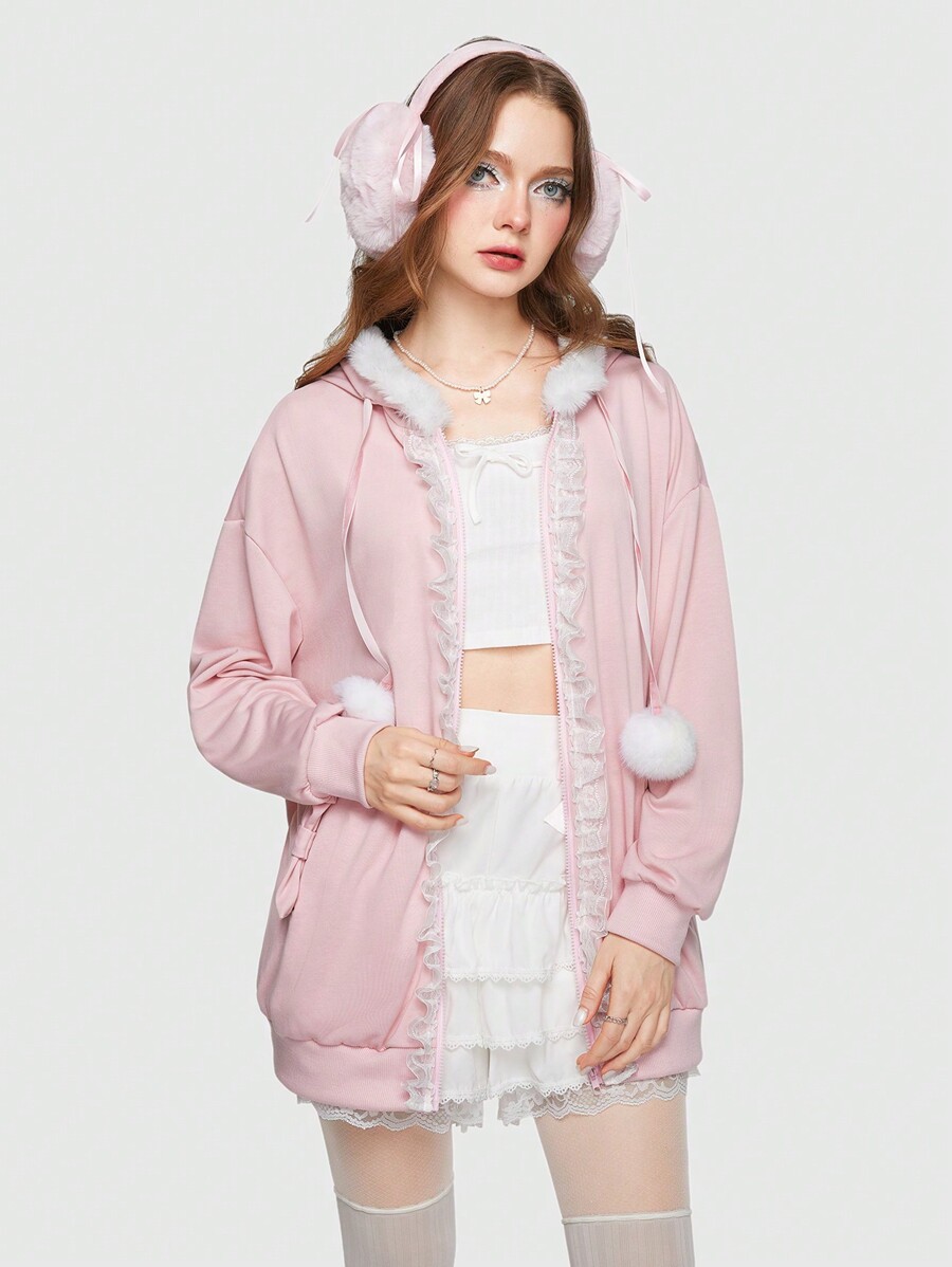 Kawaii Sweat-Shirt À Capuche En Dentelle Zippé À Ourlet Duveteux