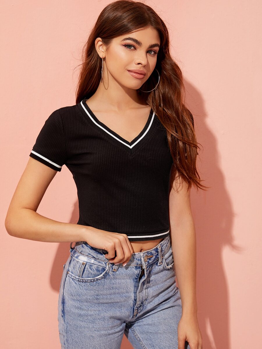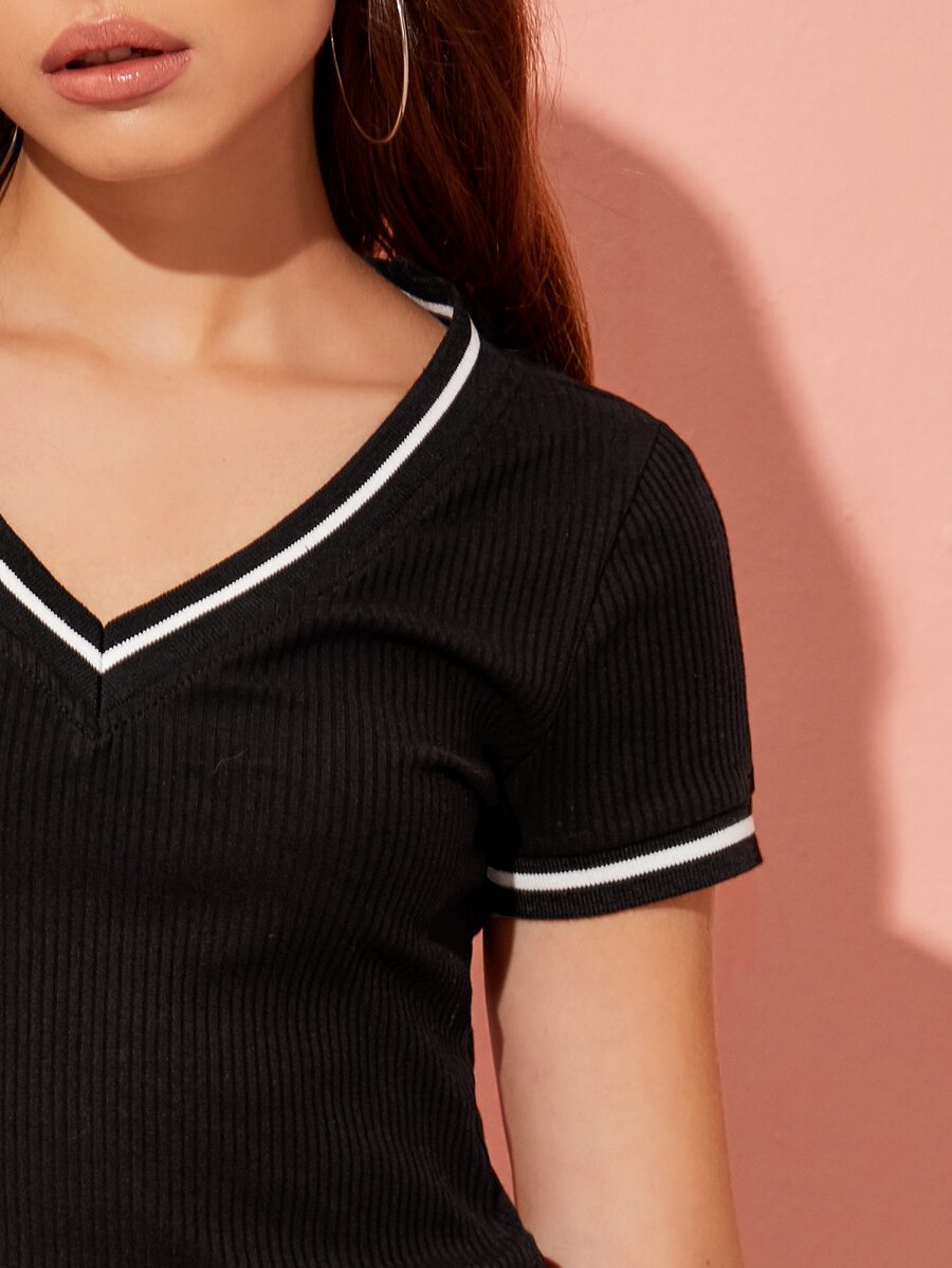 T-shirt court côtelé avec bande rayée