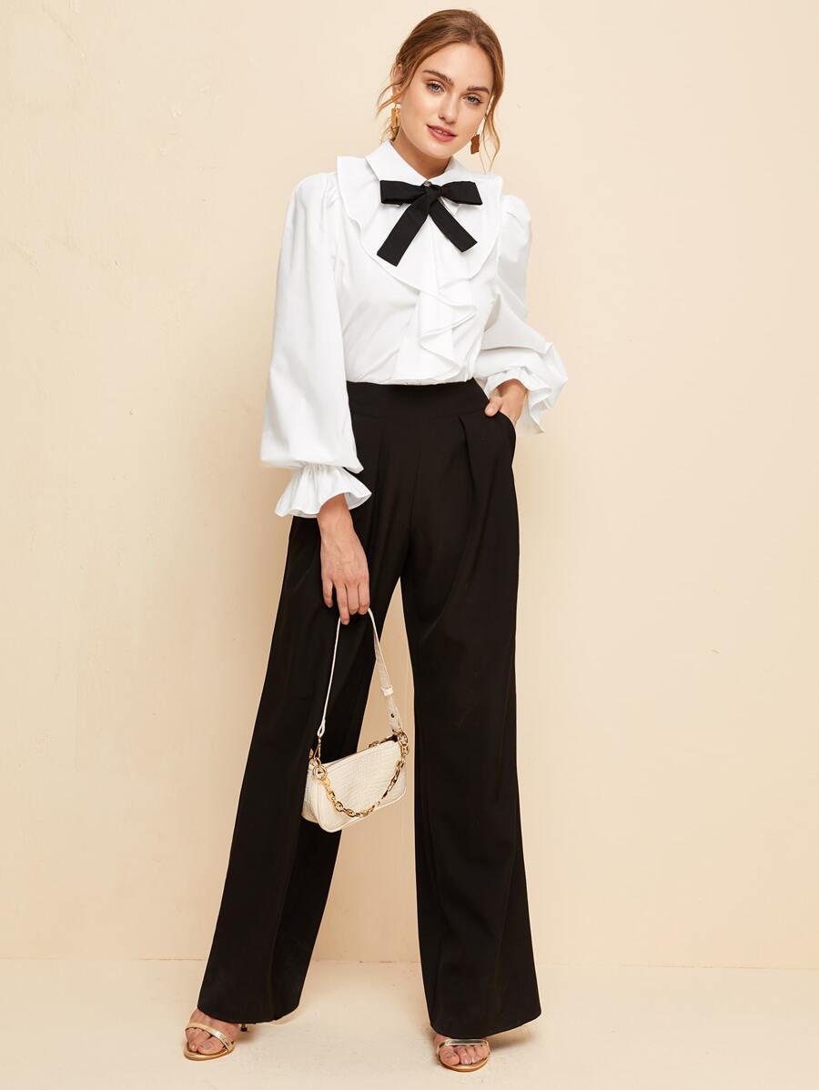 Top En Coton À Nœud Détail Jabot Manches Évasées Vêtements De Travail