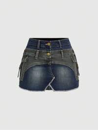 ROMWE Avant Mini-jupe en jean sexy pour femmes avec double taille et décoration métallique à la taille basse