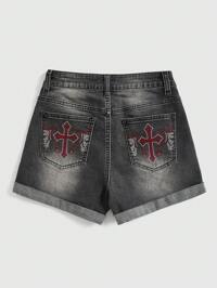 Grunge Punk Short en jean pour femmes avec décoration de croix et de strass, école