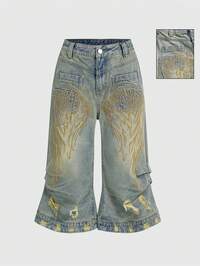 Grunge Punk Short en jean vintage sexy Y2K avec ailes d'ange brodées, froissé et taille basse pour femmes