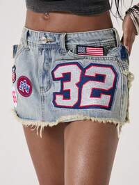 EDITION Jupe en jean mini taille basse, vintage, punk, brodée et délavée