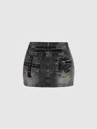 Grunge Punk Jupe mini en jean sexy à taille basse, cloutée de crânes vintage et délavée
