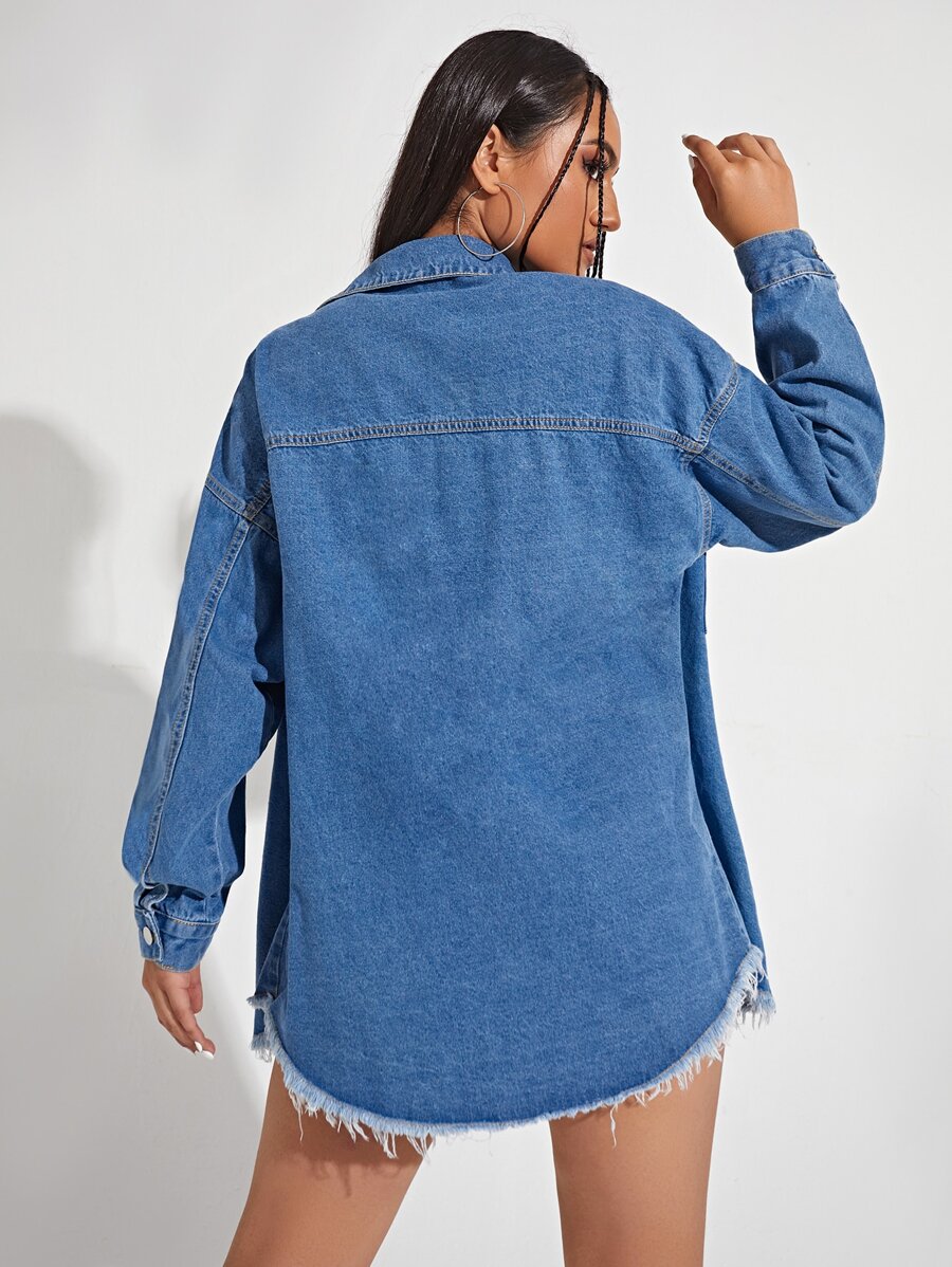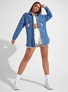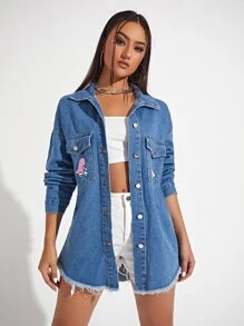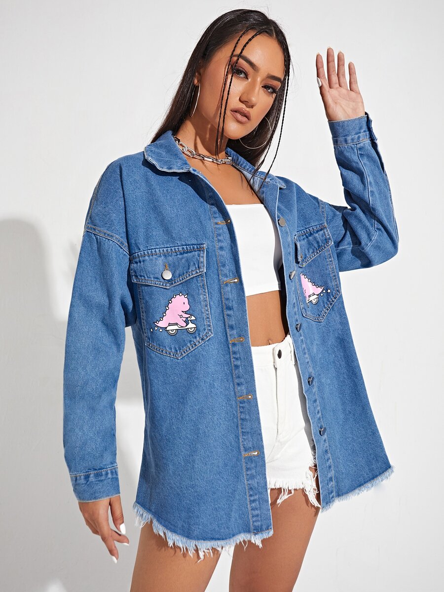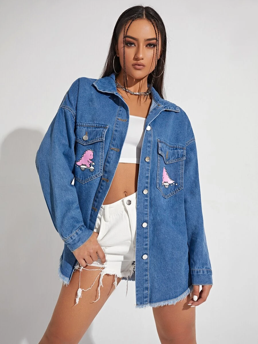 Veste en jean à imprimé dinosaure à ourlet effiloché poche à rabat
