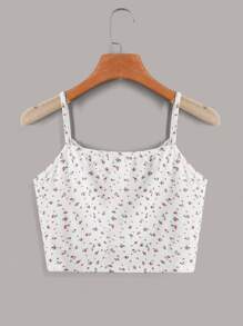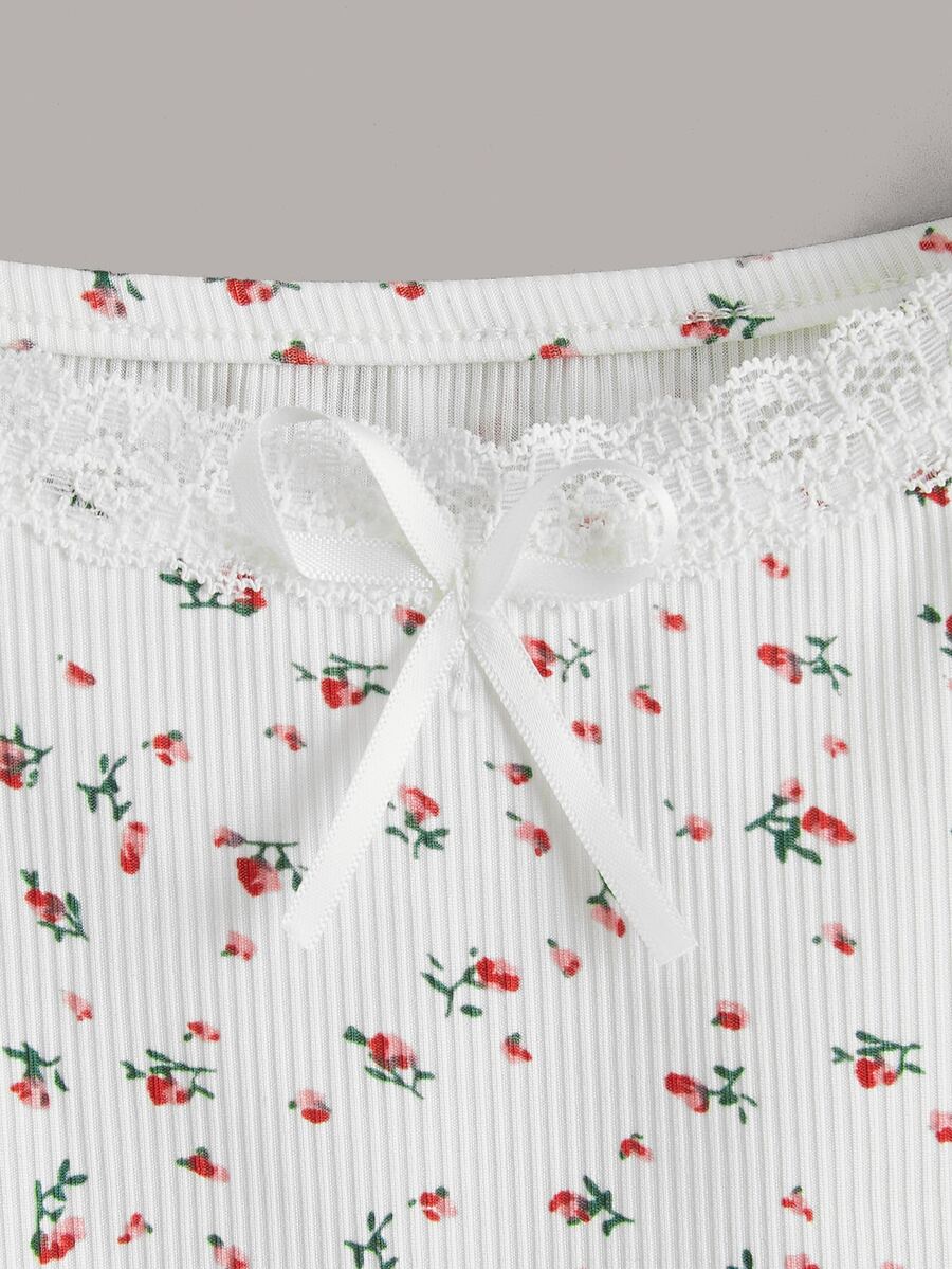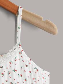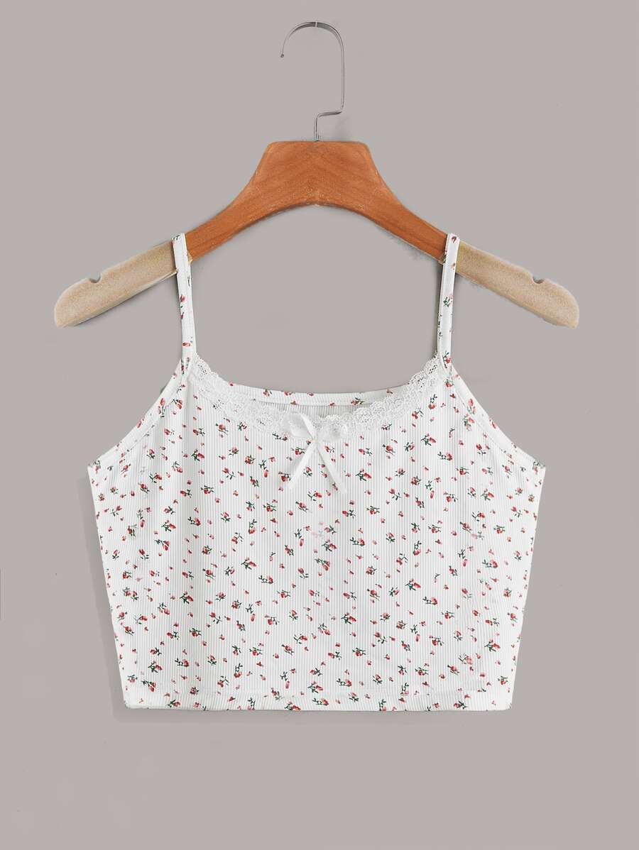 Top à fines brides court fleuri ourlet en dentelle côtelé