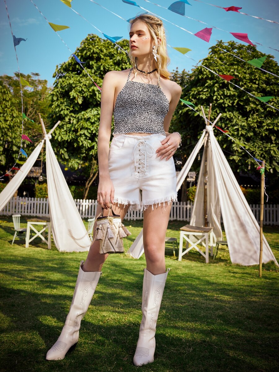 Top ras-du-cou fleuri froncé dos-nu à nœud
