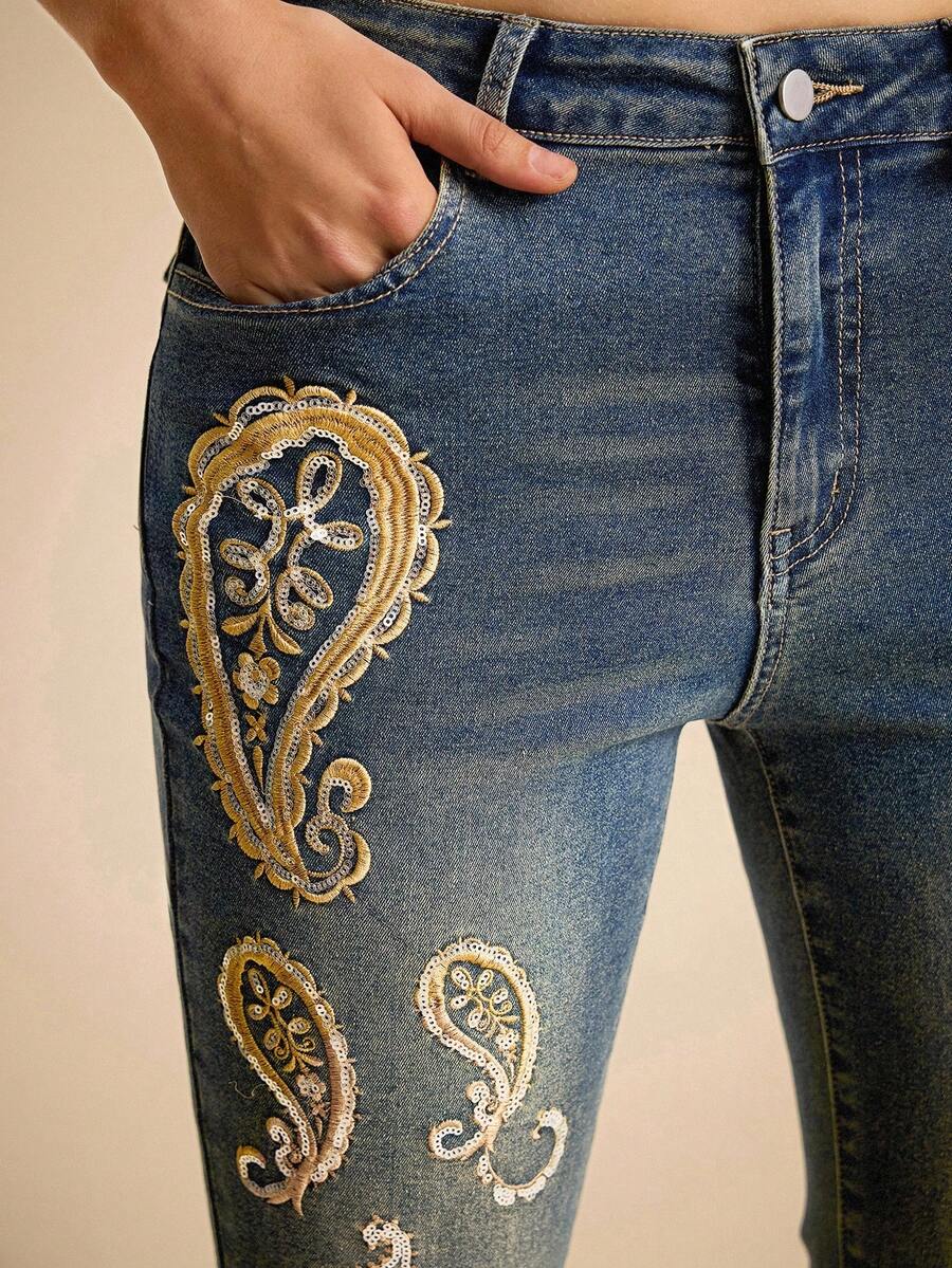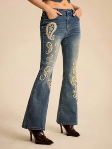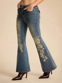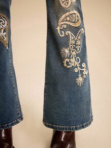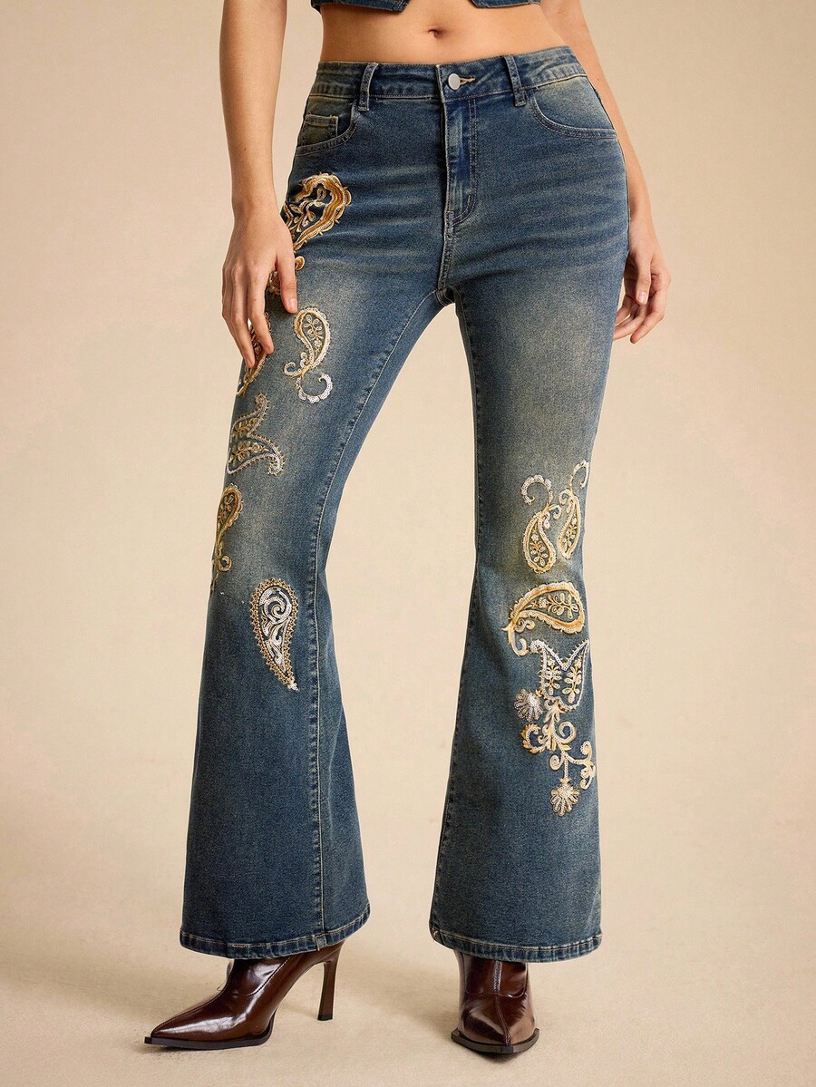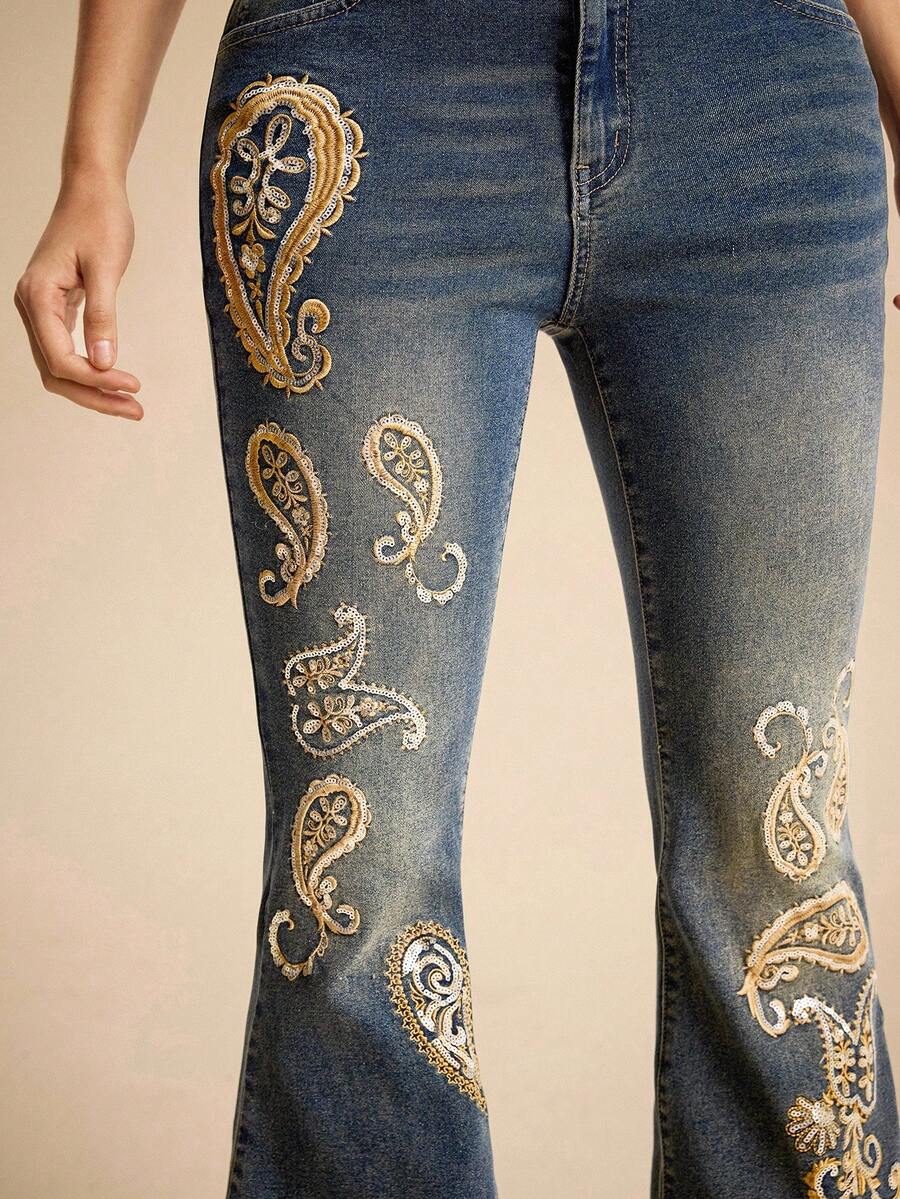 EDITION Jeans évasés taille basse pour femmes, style rétro hippie avec imprimé cachemire, paillettes et broderie