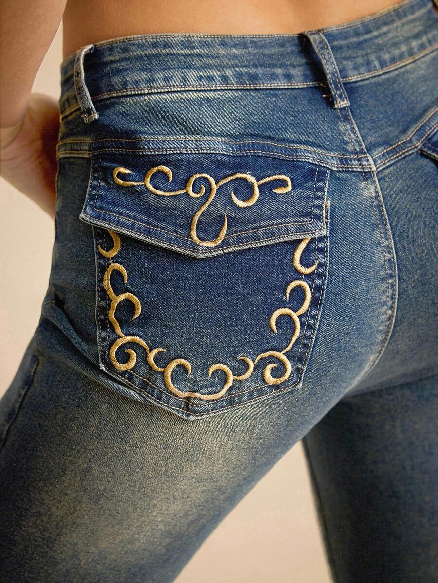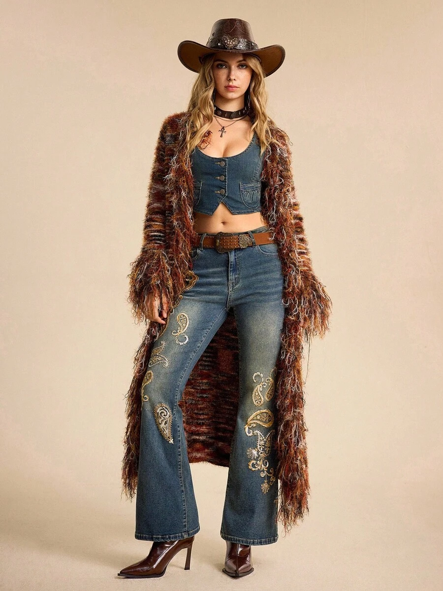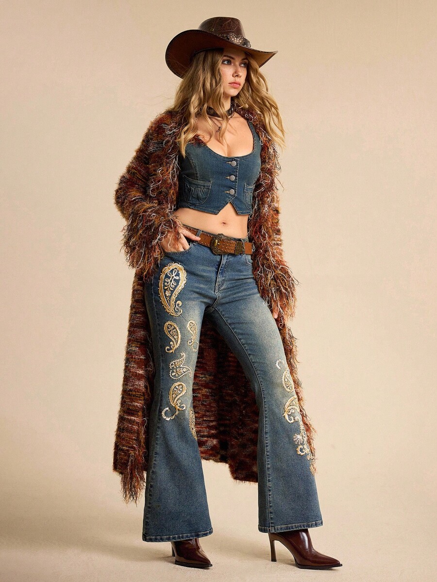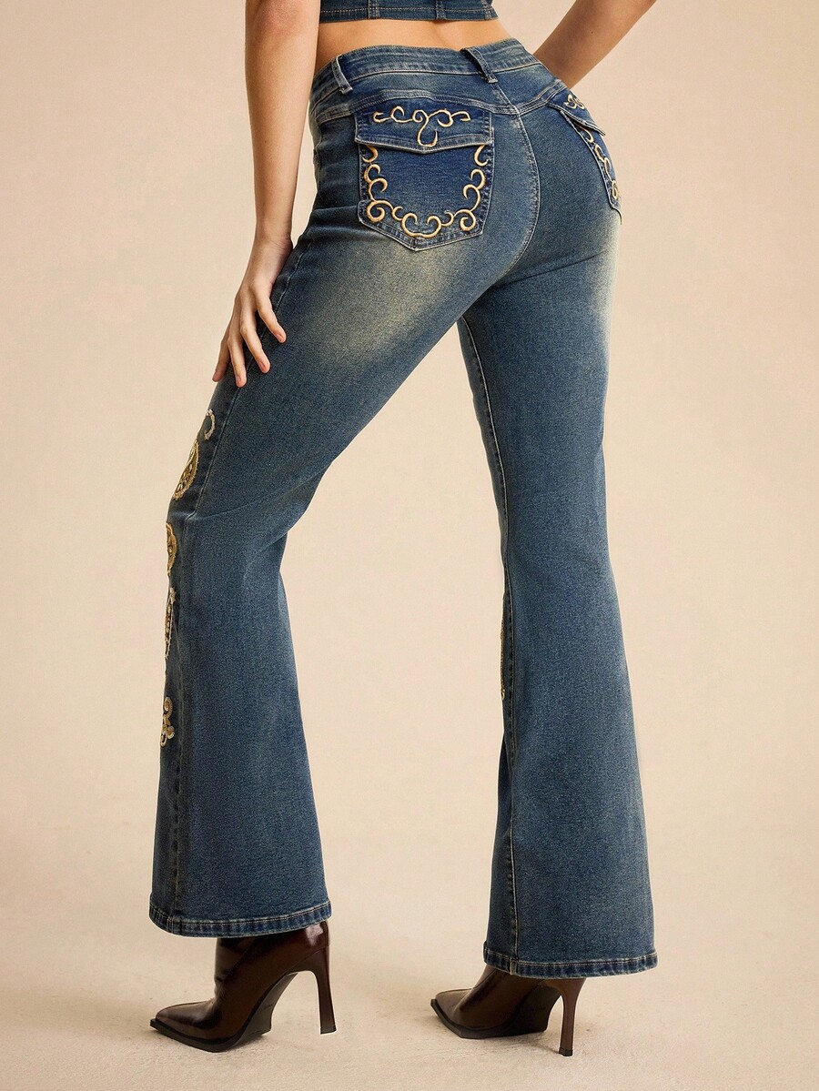 EDITION Jeans évasés taille basse pour femmes, style rétro hippie avec imprimé cachemire, paillettes et broderie