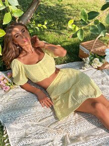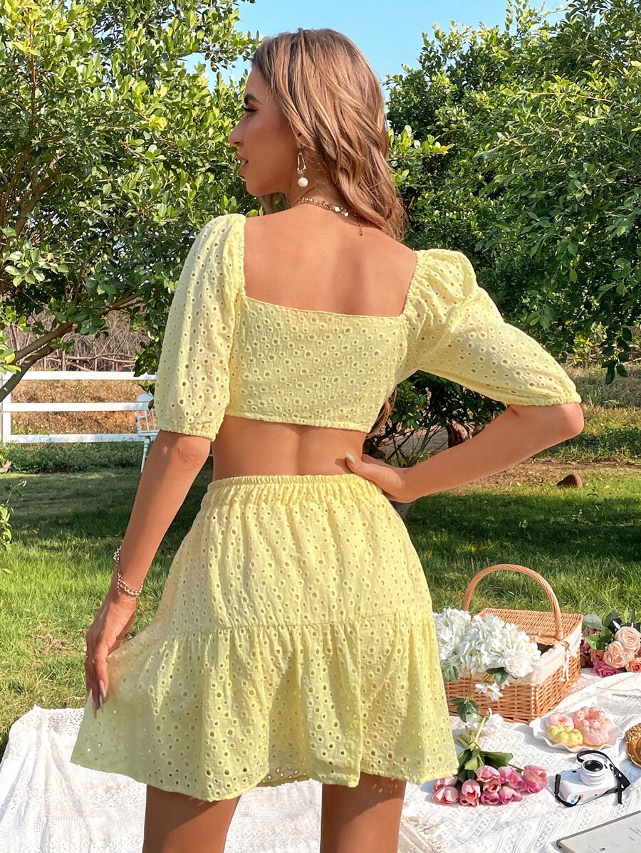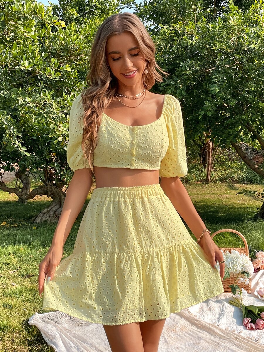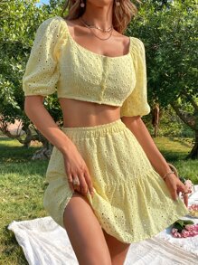 Blouse courte à broderie anglaise manches bouffantes & Jupe à volants